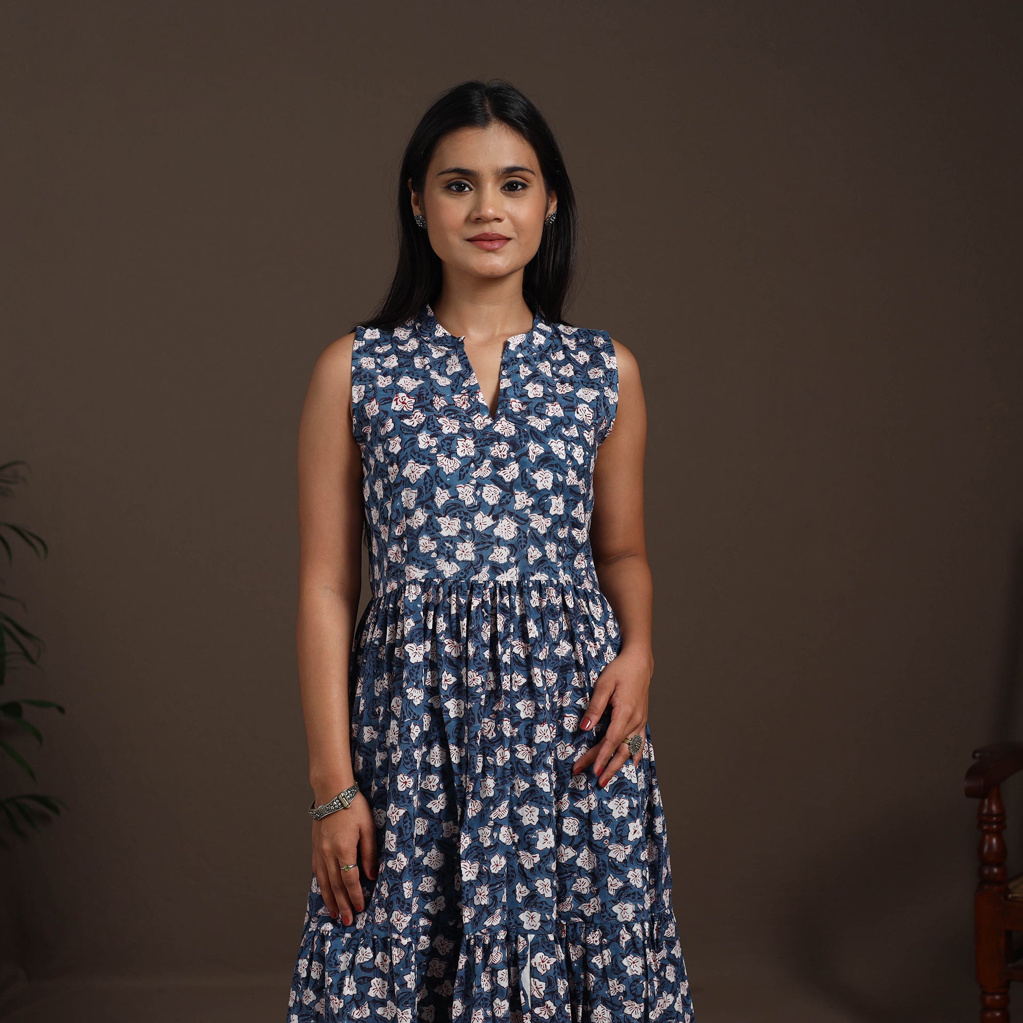 This blue hand block print sleeveless tiered sanganeri dress beautifully combines tradition with comfort. Featuring delicate sanganeri block prints from Rajasthan, it showcases vibrant motifs that bring charm to everyday wear. The sleeveless tiered silhouette is light, airy, and easy to carry through the day, making it perfect for casual outings, office wear, or relaxed gatherings.