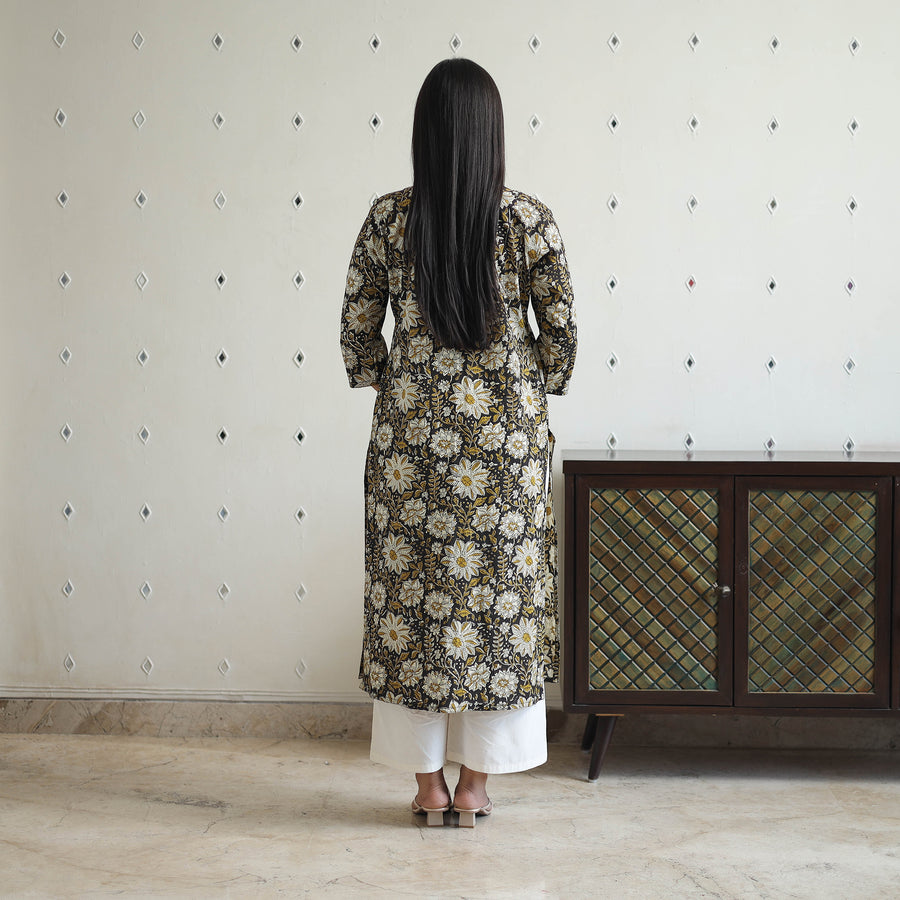 Hand block printed cotton straight pintuck bagru kurta, using natural dyes on cotton. Crafted in Bagru, Rajasthan, the intricate patterns are created with hand-carved wooden blocks. This kurta includes a side pocket for added convenience, making it both stylish and practical. Perfect for all occasions.