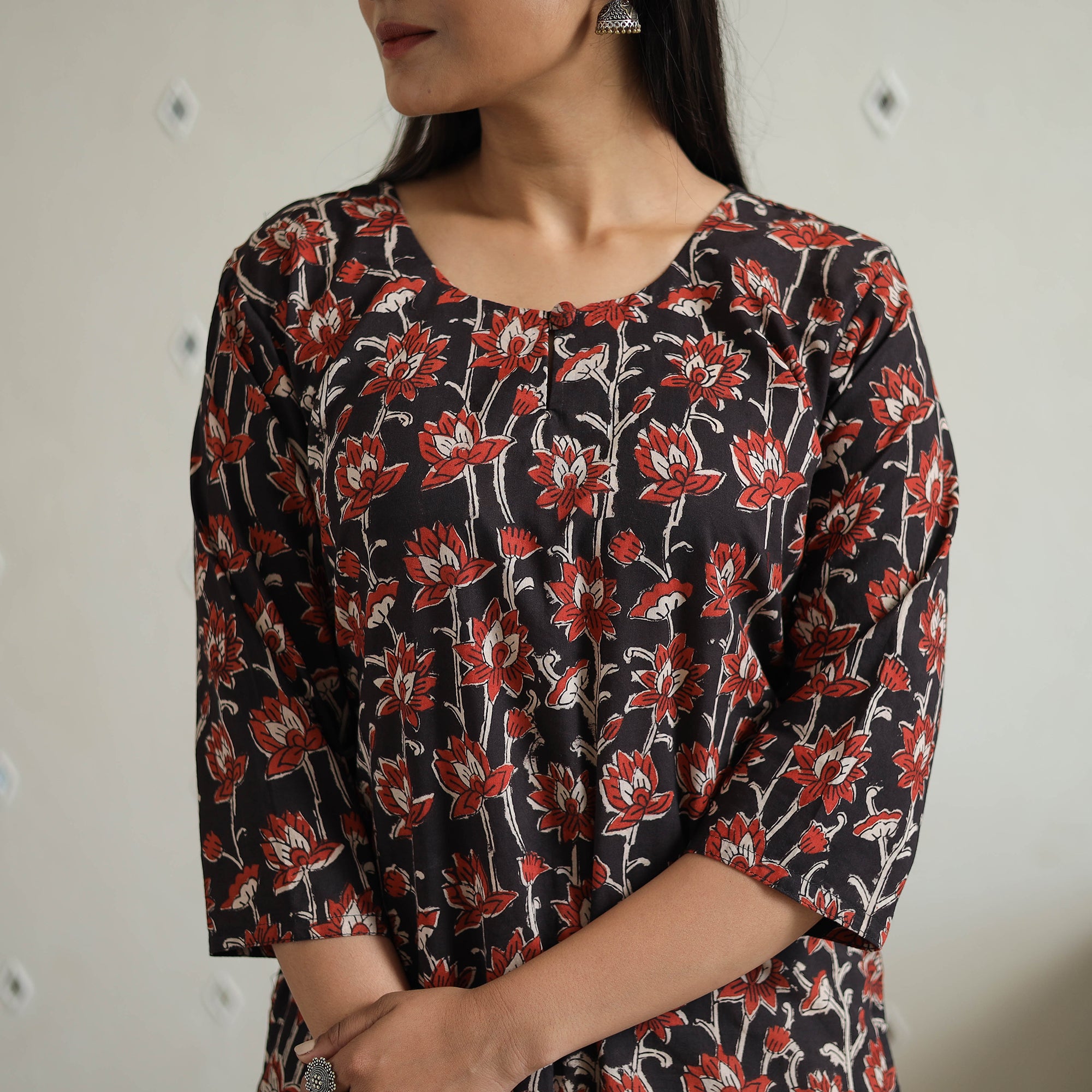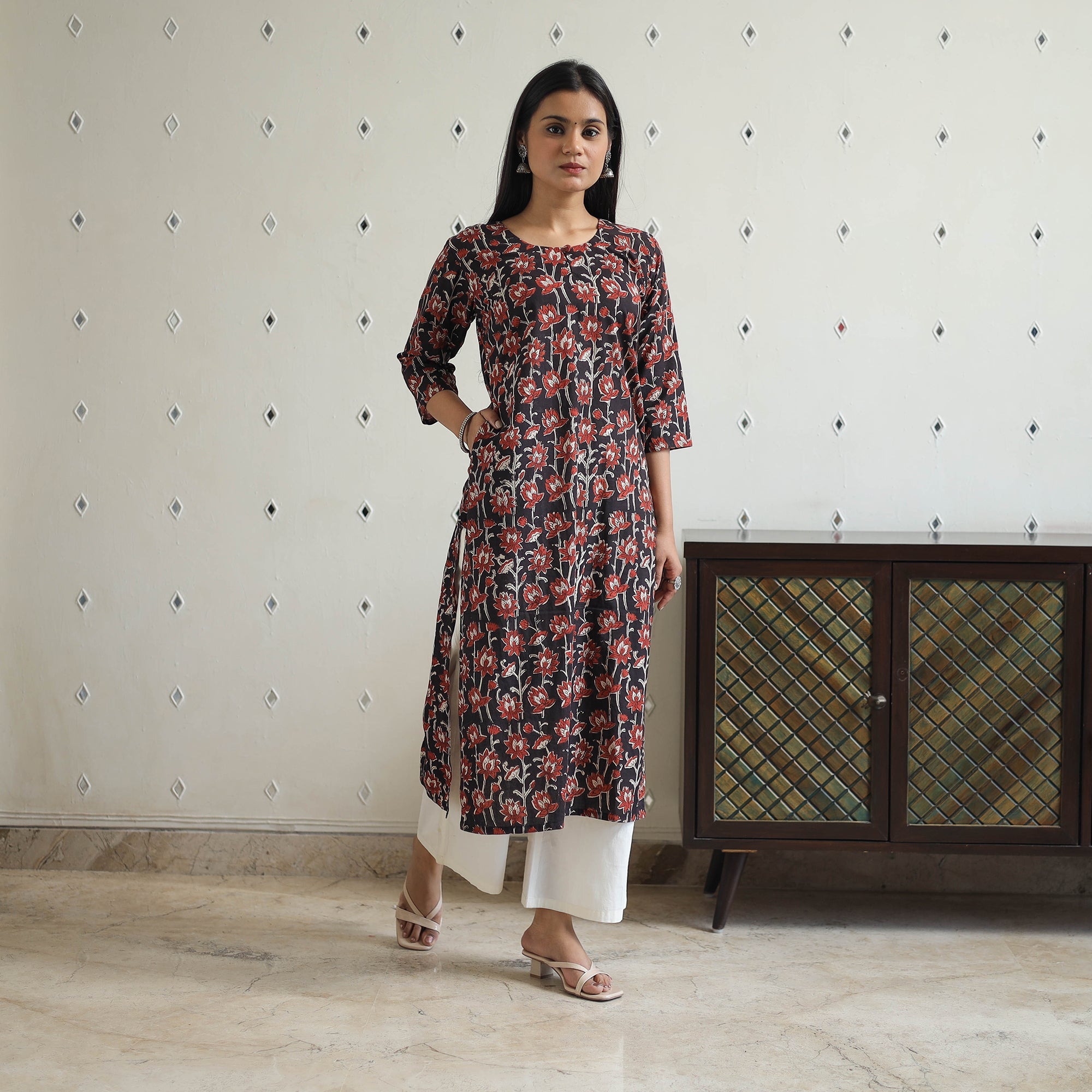 Hand block printed cotton straight bagru kurta, using natural dyes on cotton. Crafted in Bagru, Rajasthan, the intricate patterns are created with hand-carved wooden blocks. This kurta includes a side pocket for added convenience, making it both stylish and practical. Perfect for all occasions.