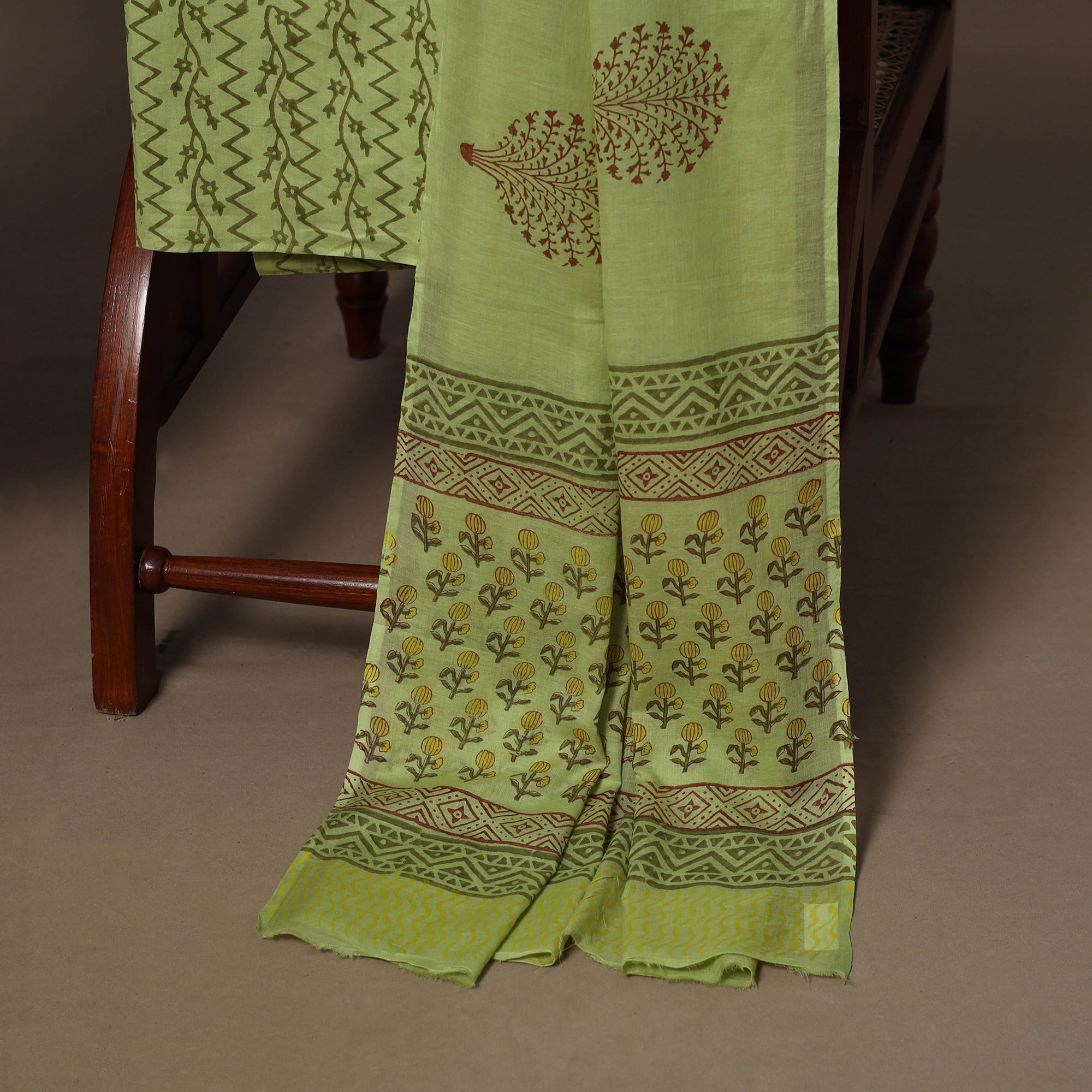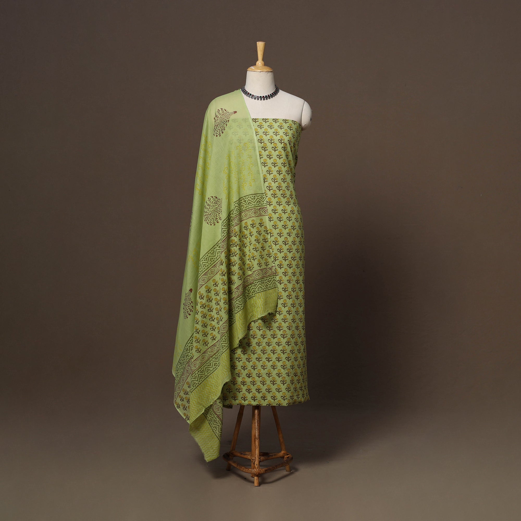 Green sanganeri hand block printed cotton 3pc unstitched dress material, using the traditional hand block printing technique of Sanganer, a town in the southern part of Jaipur, Rajasthan. This printing technique is over 500 years old and is practiced by skilled artisans who use time-honoured methods passed down through generations. It features fine patterns created with hand-carved wooden blocks and bleed-free VAT dyes, highlighting detailed boota, floral and geometric motifs. The set includes kurta fabric, bottom fabric and a mul cotton dupatta, which can be easily tailored into your preferred style.