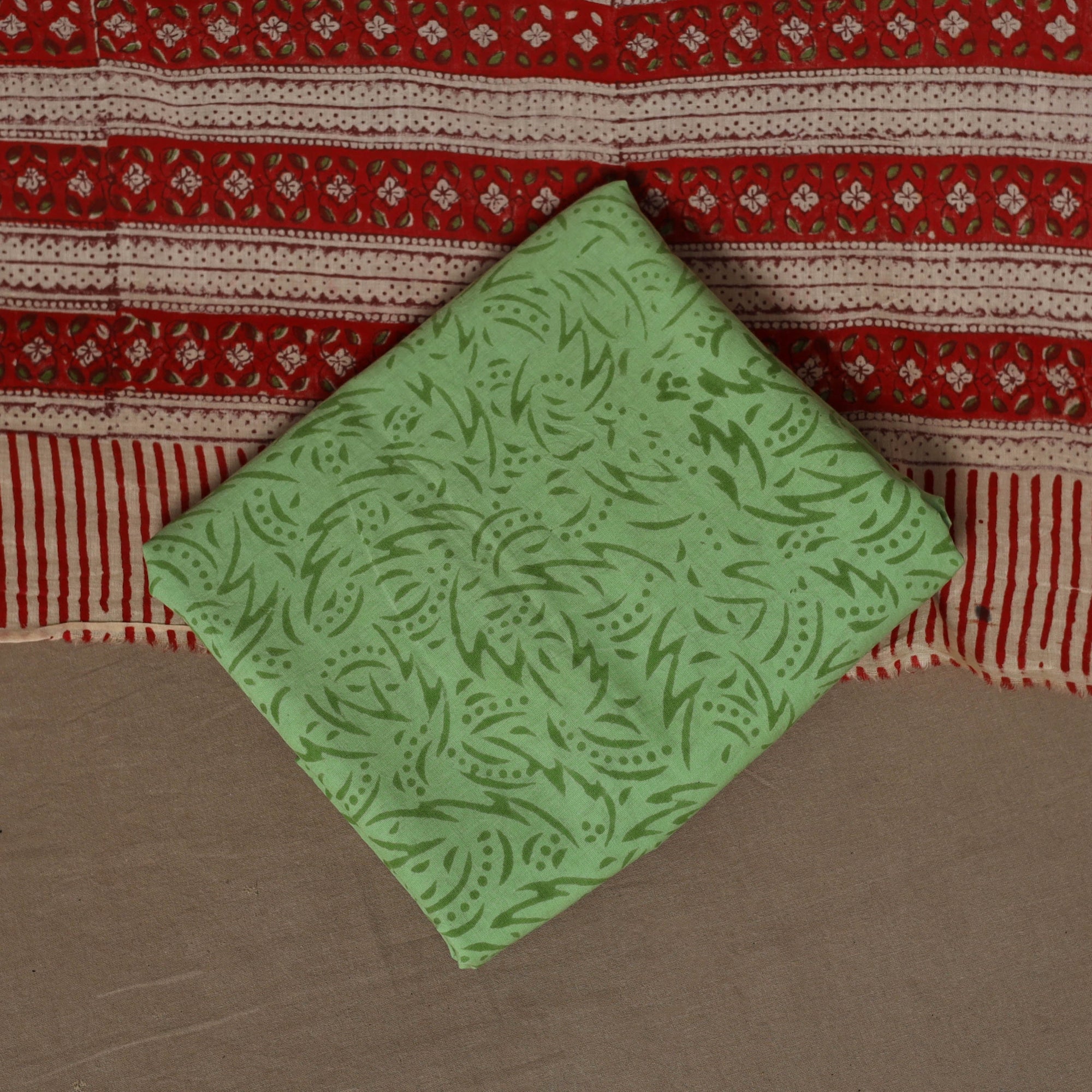Red sanganeri hand block printed cotton 3pc unstitched dress material, using the traditional hand block printing technique of Sanganer, a town in the southern part of Jaipur, Rajasthan. This printing technique is over 500 years old and is practiced by skilled artisans who use time-honoured methods passed down through generations. It features fine patterns created with hand-carved wooden blocks and bleed-free VAT dyes, highlighting detailed boota, floral and geometric motifs. The set includes kurta fabric, bottom fabric and a mul cotton dupatta, which can be easily tailored into your preferred style.