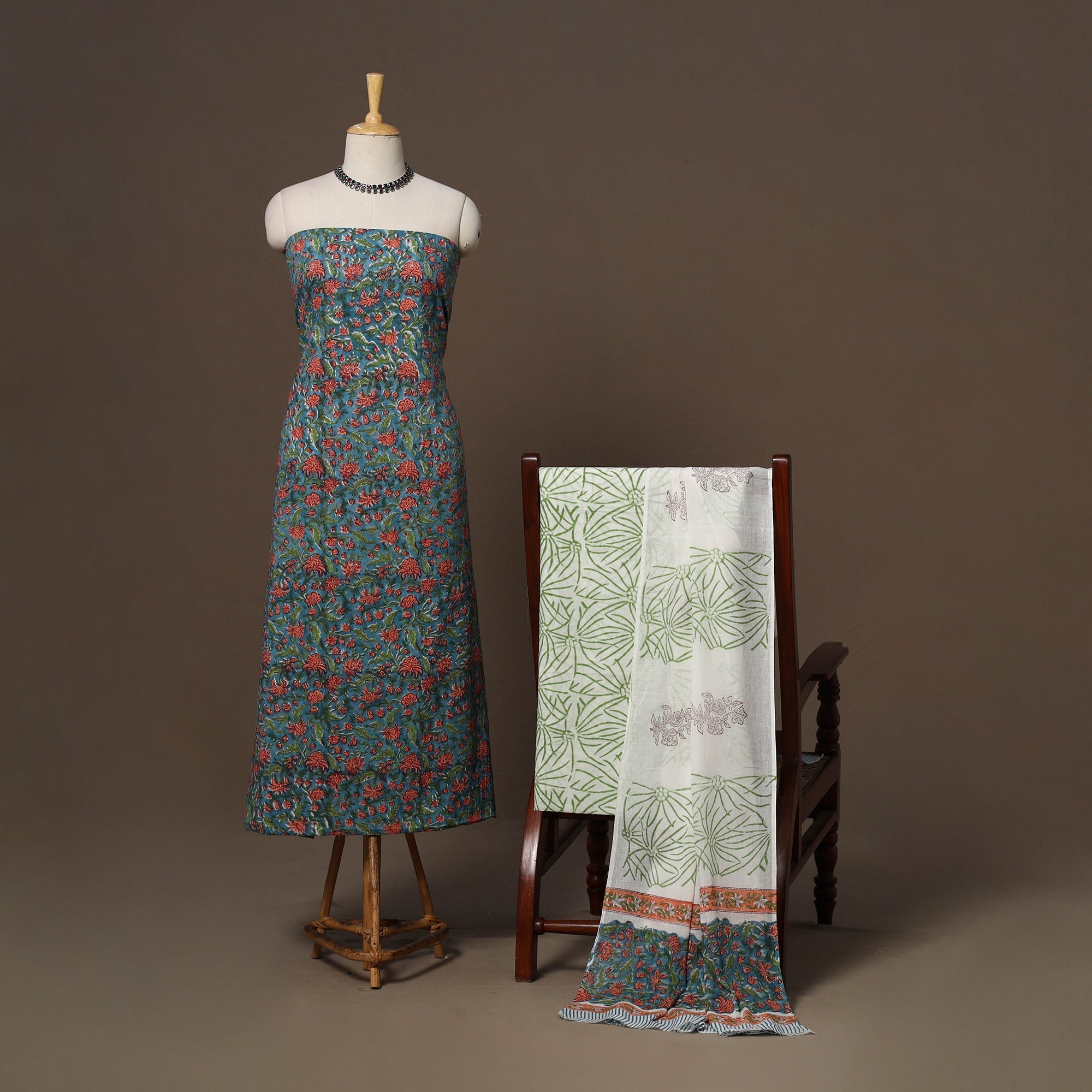 Blue sanganeri hand block printed cotton 3pc unstitched dress material, using the traditional hand block printing technique of Sanganer, a town in the southern part of Jaipur, Rajasthan. This printing technique is over 500 years old and is practiced by skilled artisans who use time-honoured methods passed down through generations. It features fine patterns created with hand-carved wooden blocks and bleed-free VAT dyes, highlighting detailed boota, floral and geometric motifs. The set includes kurta fabric, bottom fabric and a mul cotton dupatta, which can be easily tailored into your preferred style.