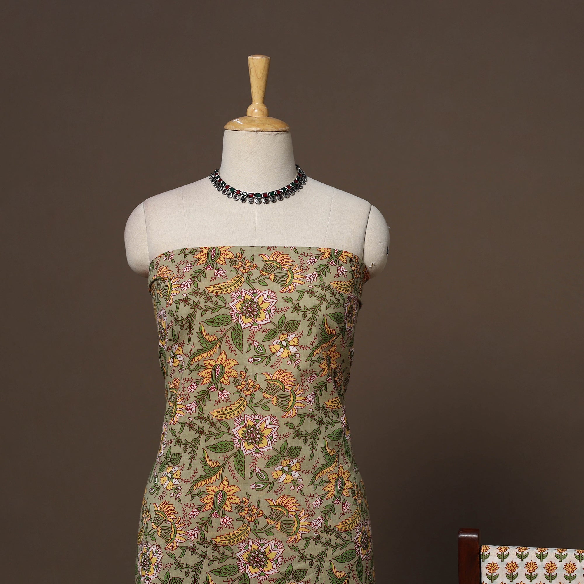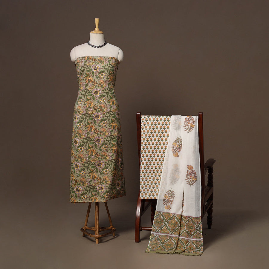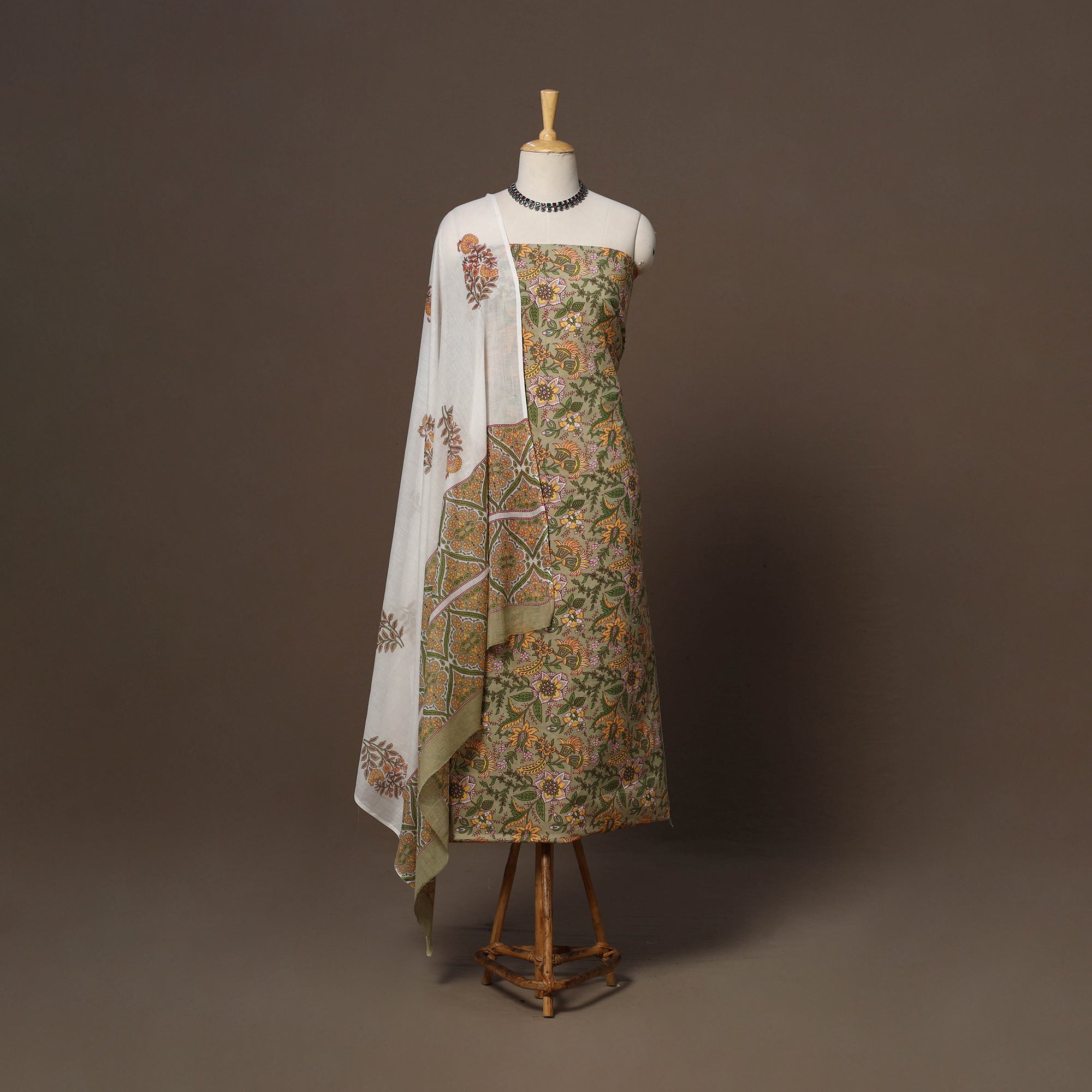 Green sanganeri hand block printed cotton 3pc unstitched dress material, using the traditional hand block printing technique of Sanganer, a town in the southern part of Jaipur, Rajasthan. This printing technique is over 500 years old and is practiced by skilled artisans who use time-honoured methods passed down through generations. It features fine patterns created with hand-carved wooden blocks and bleed-free VAT dyes, highlighting detailed boota, floral and geometric motifs. The set includes kurta fabric, bottom fabric and a mul cotton dupatta, which can be easily tailored into your preferred style.