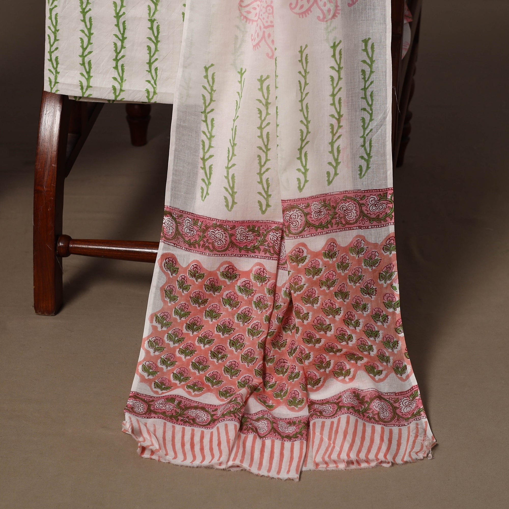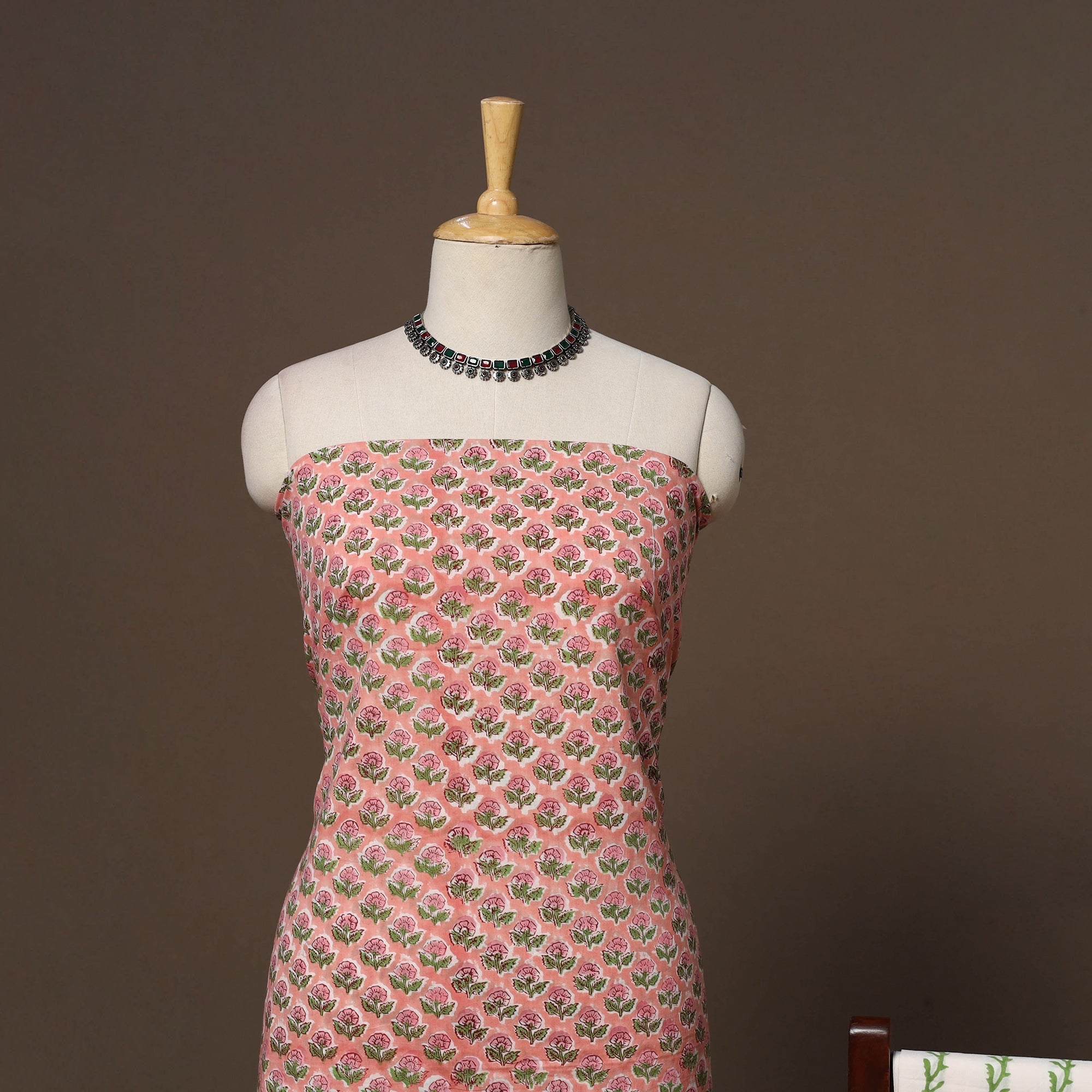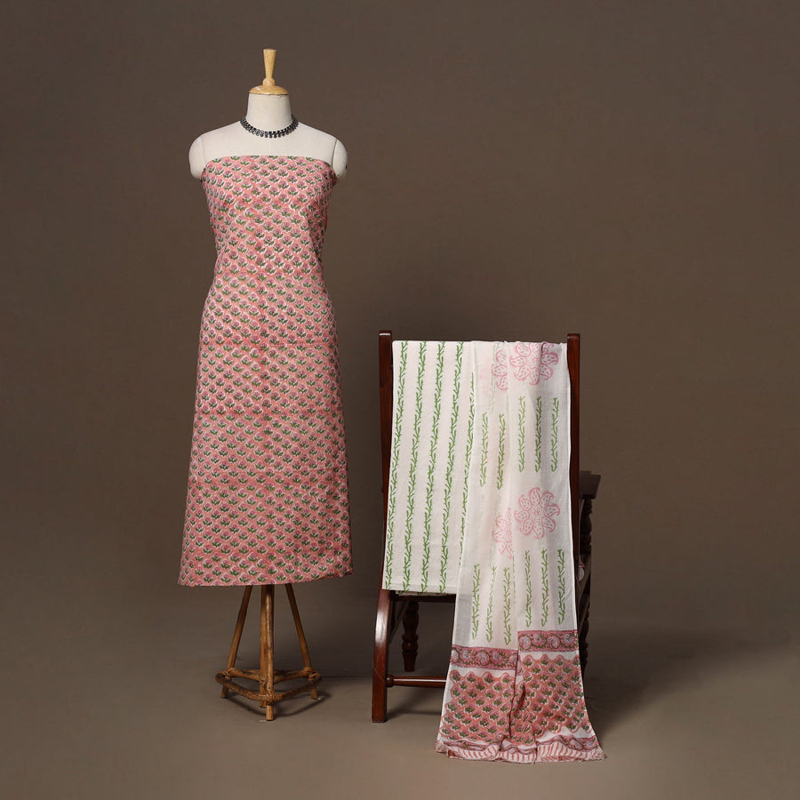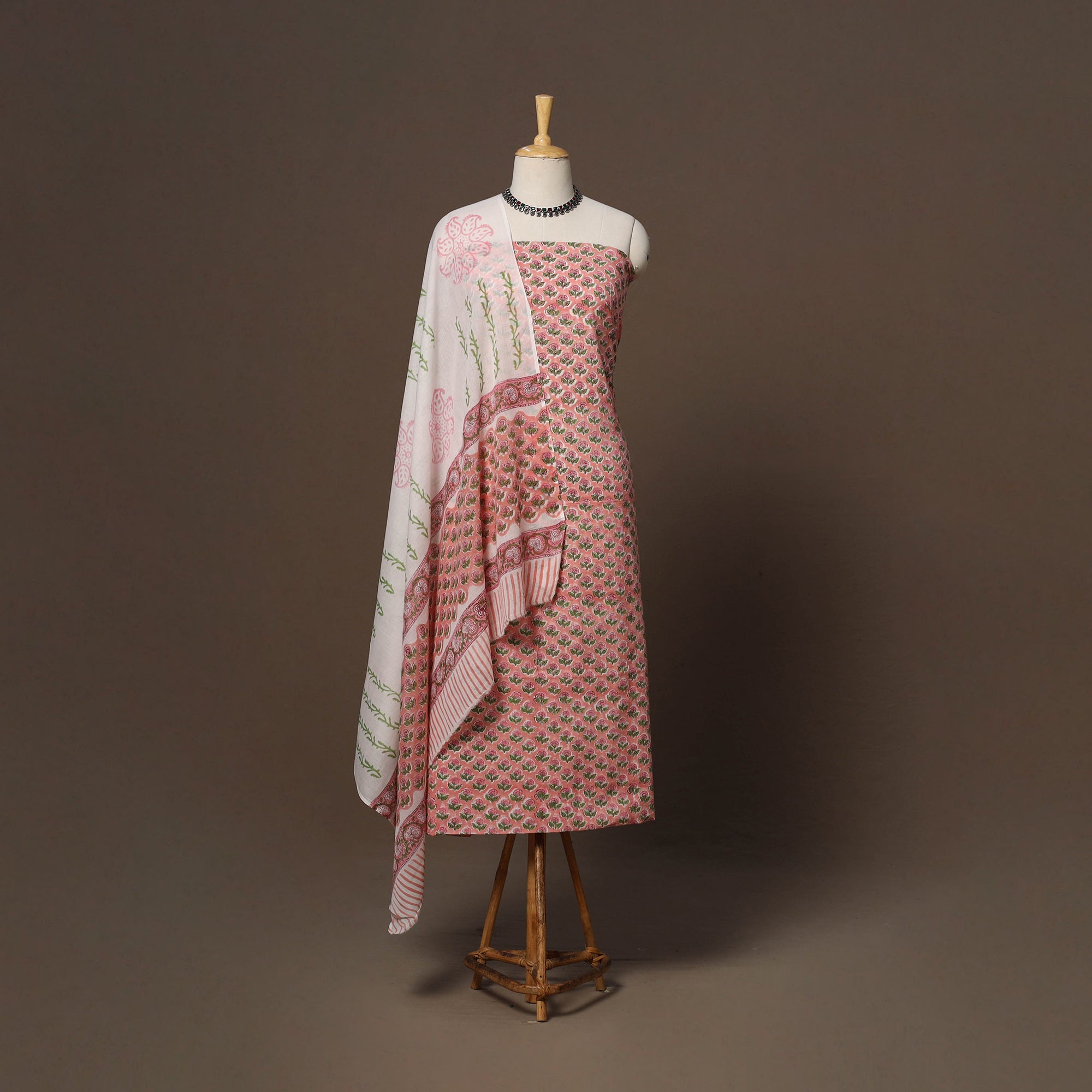 Pink sanganeri hand block printed cotton 3pc unstitched dress material, using the traditional hand block printing technique of Sanganer, a town in the southern part of Jaipur, Rajasthan. This printing technique is over 500 years old and is practiced by skilled artisans who use time-honoured methods passed down through generations. It features fine patterns created with hand-carved wooden blocks and bleed-free VAT dyes, highlighting detailed boota, floral and geometric motifs. The set includes kurta fabric, bottom fabric and a mul cotton dupatta, which can be easily tailored into your preferred style.