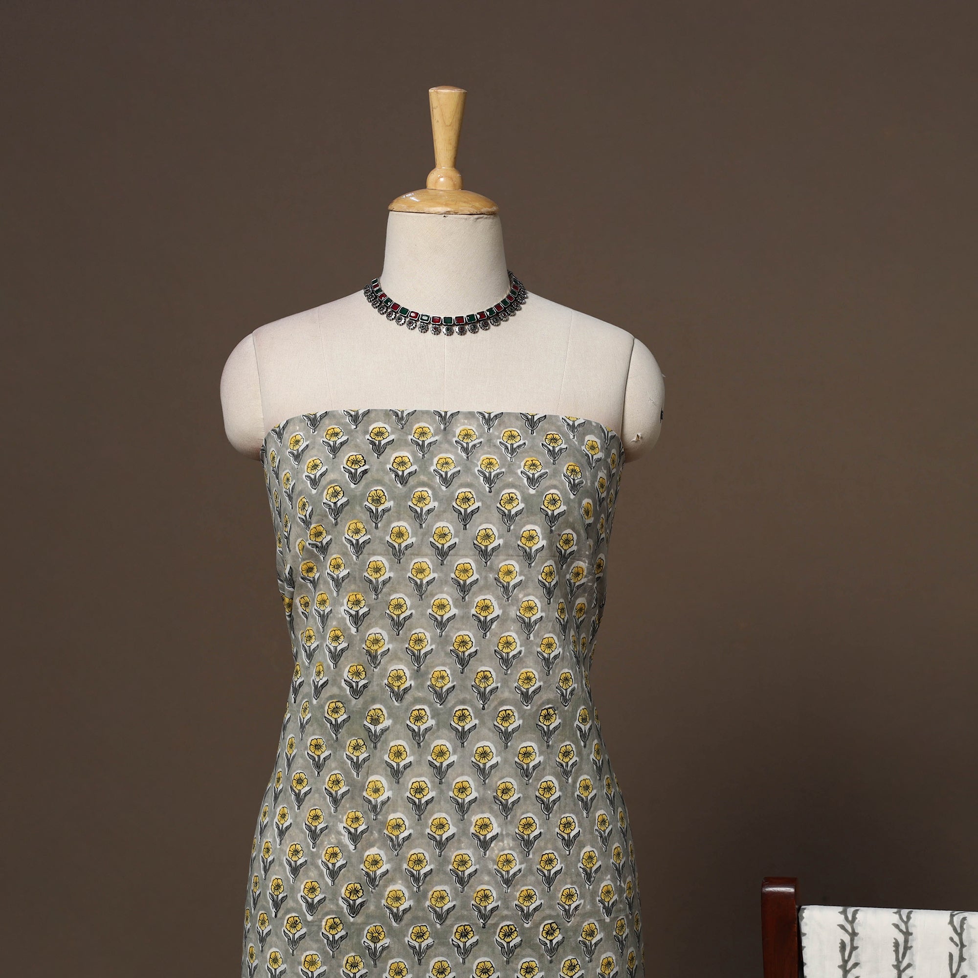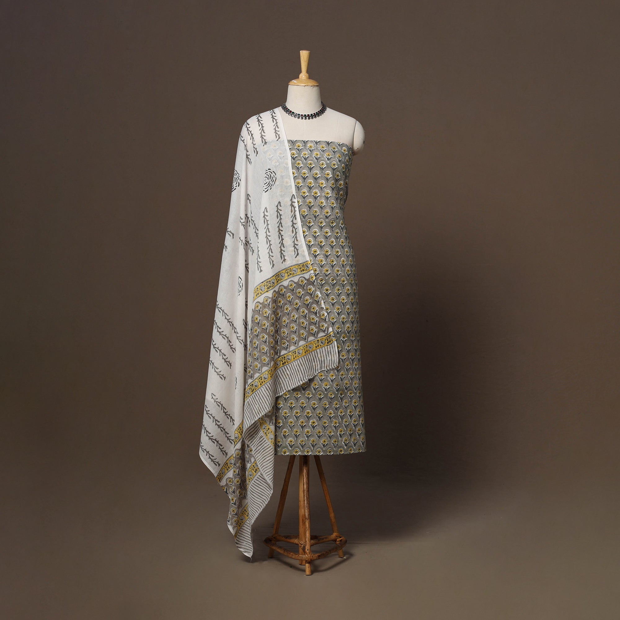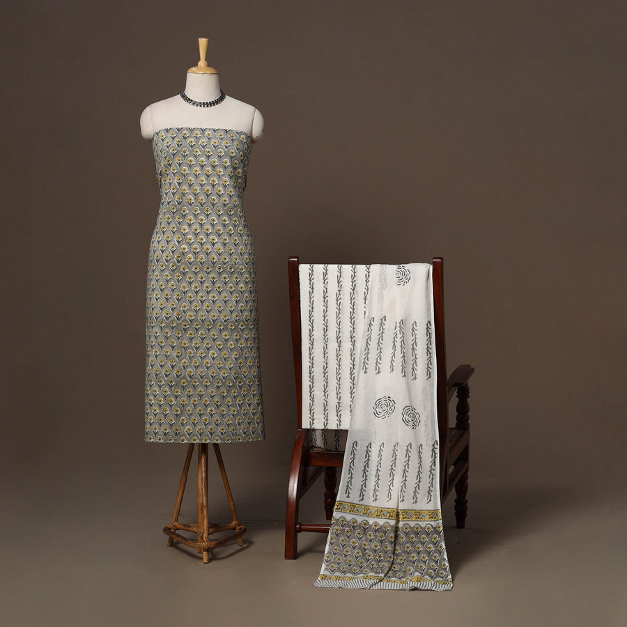 Brown sanganeri hand block printed cotton 3pc unstitched dress material, using the traditional hand block printing technique of Sanganer, a town in the southern part of Jaipur, Rajasthan. This printing technique is over 500 years old and is practiced by skilled artisans who use time-honoured methods passed down through generations. It features fine patterns created with hand-carved wooden blocks and bleed-free VAT dyes, highlighting detailed boota, floral and geometric motifs. The set includes kurta fabric, bottom fabric and a mul cotton dupatta, which can be easily tailored into your preferred style.