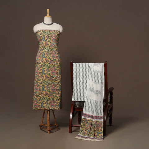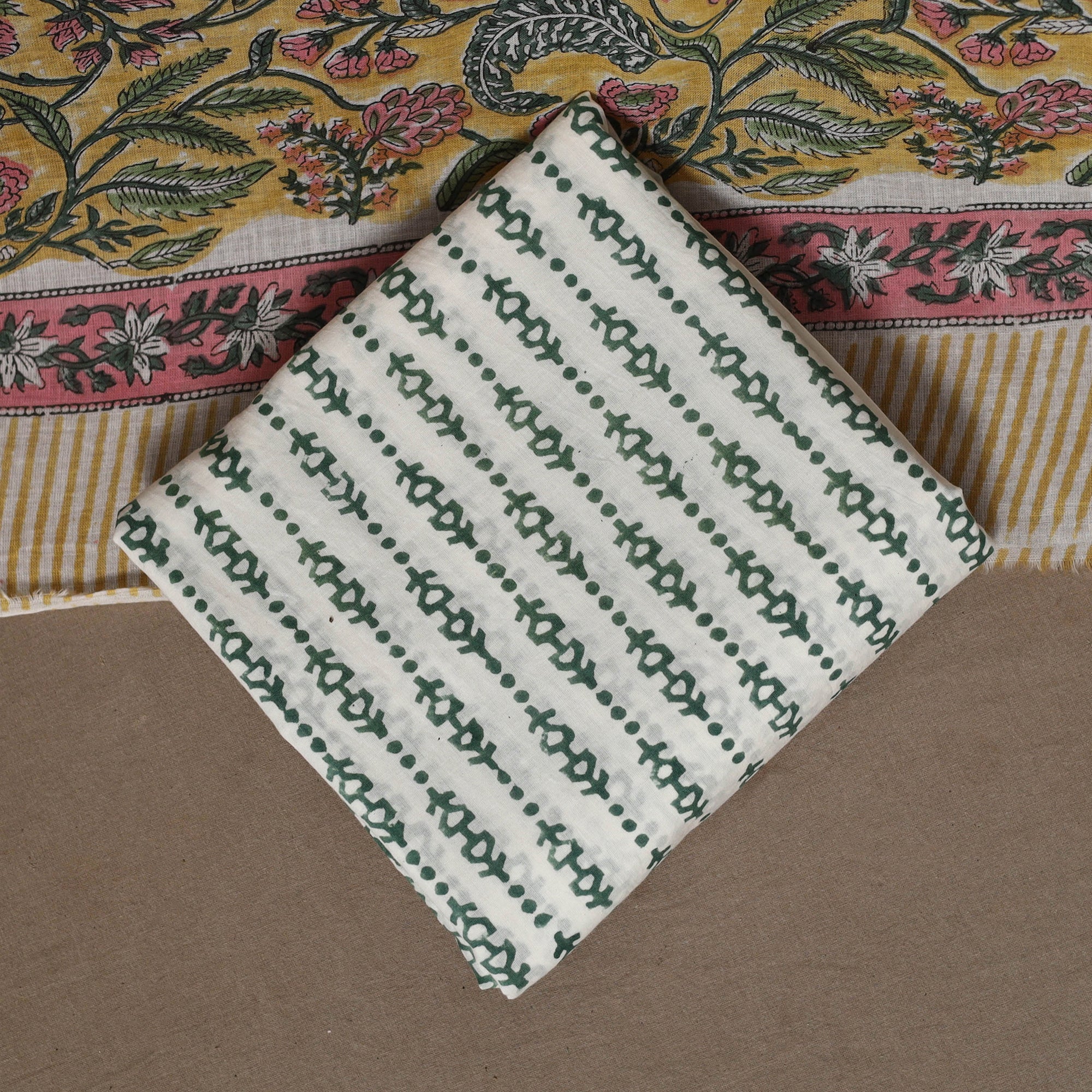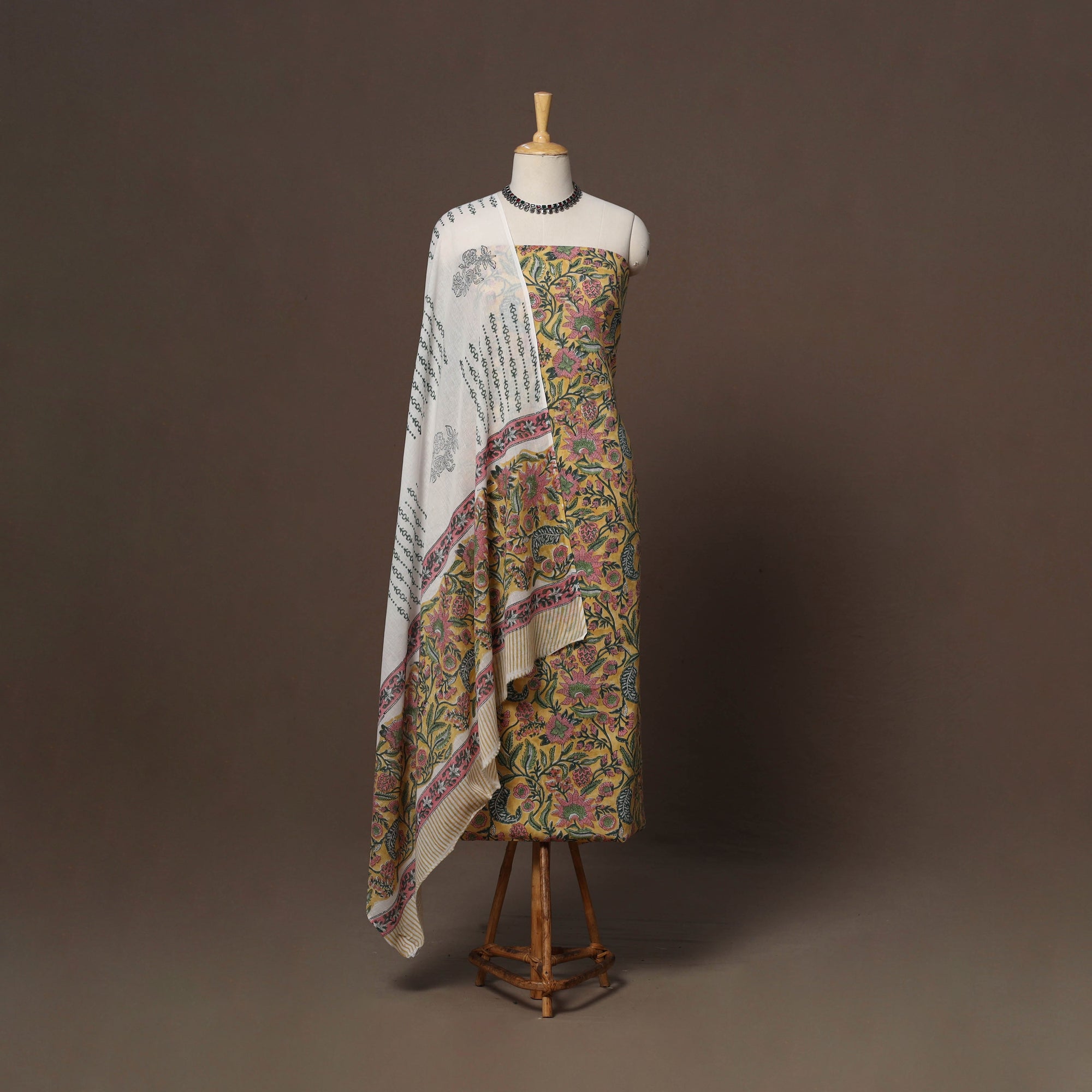 Yellow sanganeri hand block printed cotton 3pc unstitched dress material, using the traditional hand block printing technique of Sanganer, a town in the southern part of Jaipur, Rajasthan. This printing technique is over 500 years old and is practiced by skilled artisans who use time-honoured methods passed down through generations. It features fine patterns created with hand-carved wooden blocks and bleed-free VAT dyes, highlighting detailed boota, floral and geometric motifs. The set includes kurta fabric, bottom fabric and a mul cotton dupatta, which can be easily tailored into your preferred style.