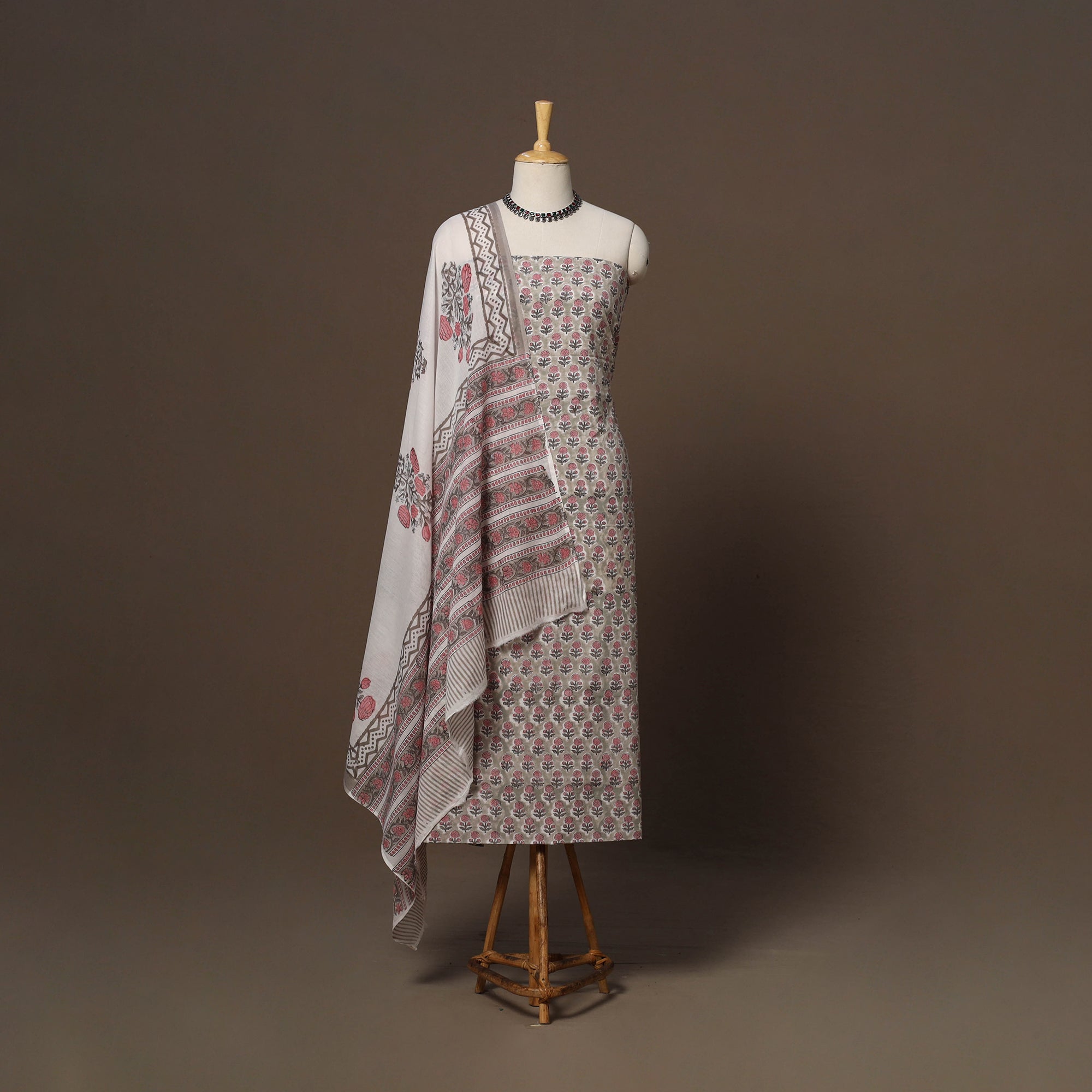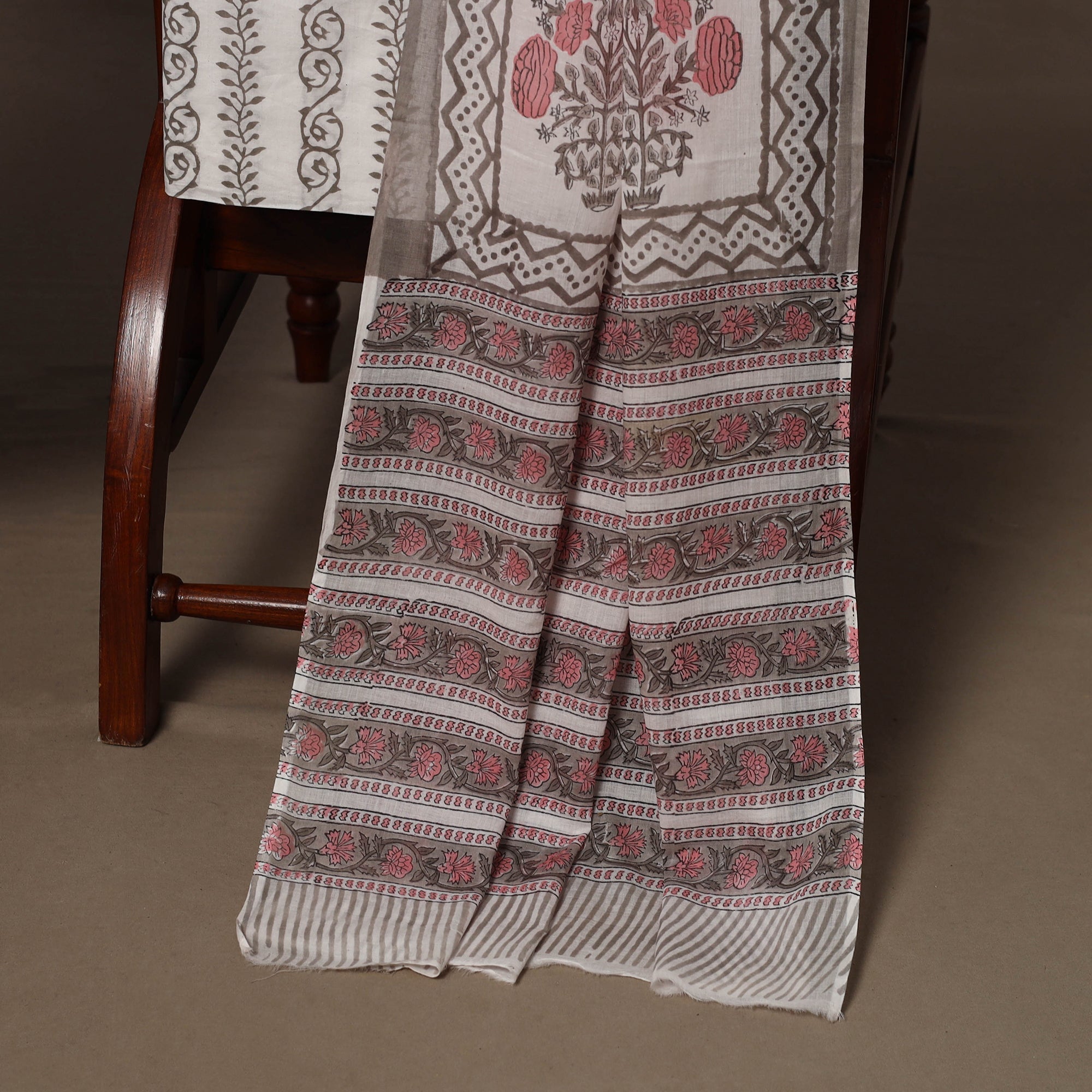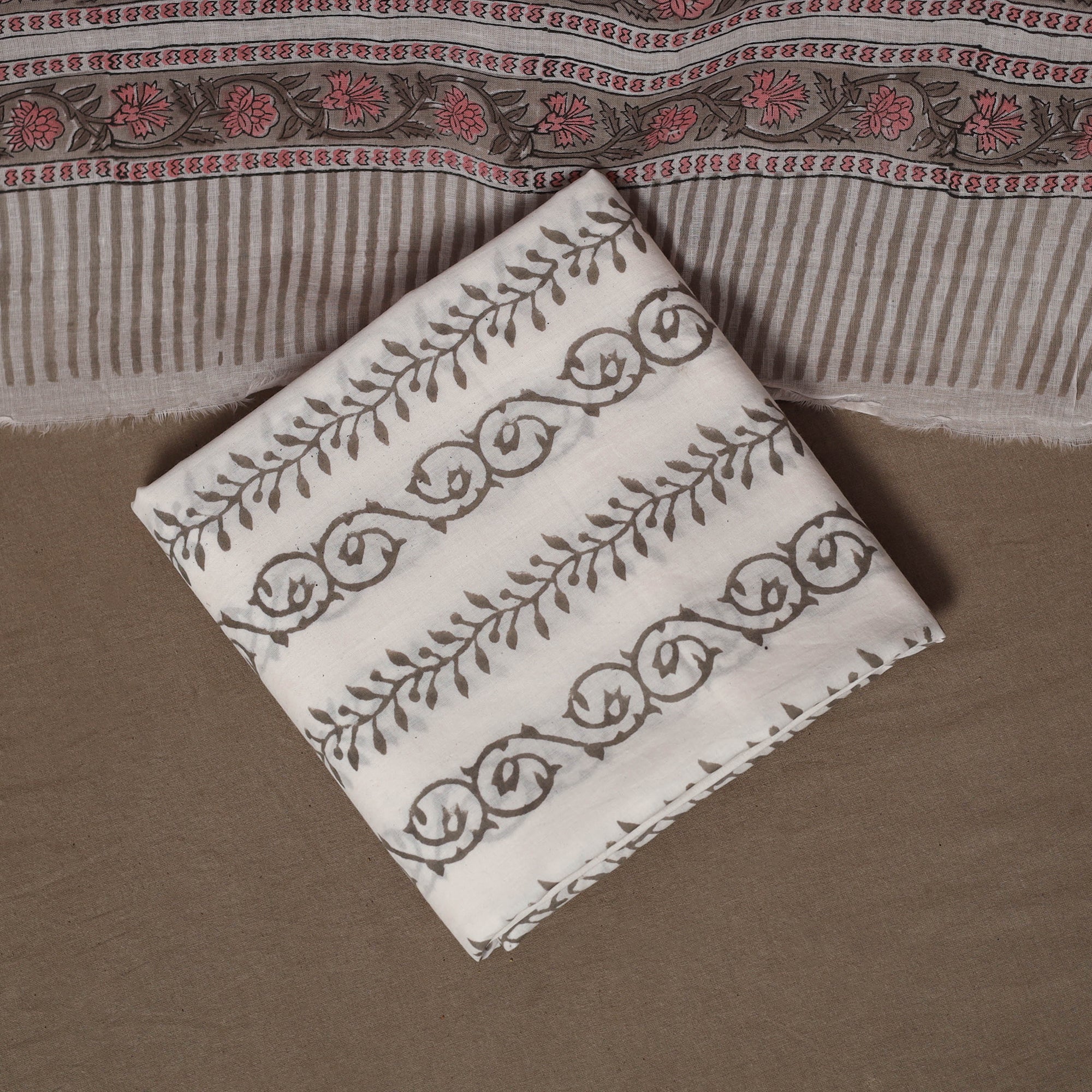 Brown sanganeri hand block printed cotton 3pc unstitched dress material, using the traditional hand block printing technique of Sanganer, a town in the southern part of Jaipur, Rajasthan. This printing technique is over 500 years old and is practiced by skilled artisans who use time-honoured methods passed down through generations. It features fine patterns created with hand-carved wooden blocks and bleed-free VAT dyes, highlighting detailed boota, floral and geometric motifs. The set includes kurta fabric, bottom fabric and a mul cotton dupatta, which can be easily tailored into your preferred style.