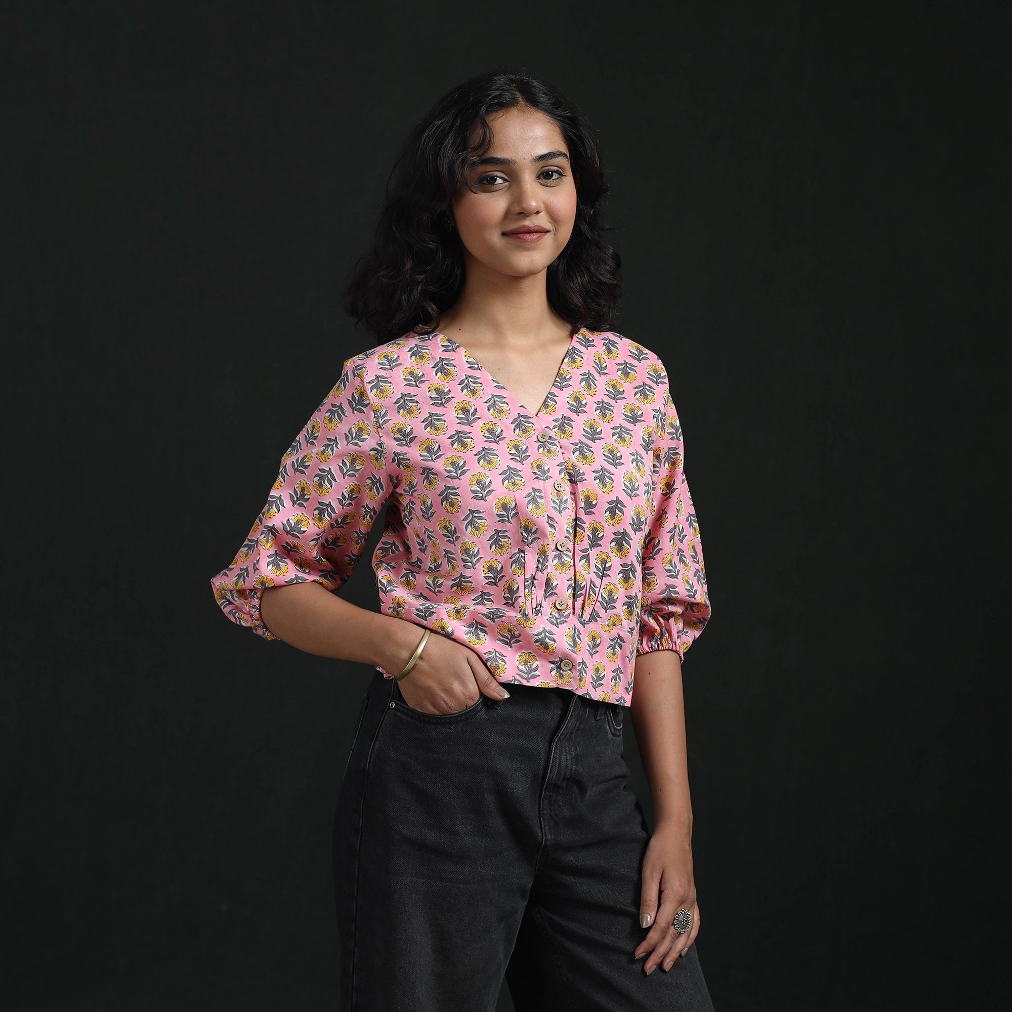 | Material | Pink sanganeri hand block print pure cotton women’s floral crop top featuring a front button placket and full sleeves. This traditional craft from Rajasthan has been practiced for over 500 years. It showcases delicate floral motifs printed with hand-carved wooden blocks and bleed-free VAT dyes. The breathable fabric ensures all-day comfort and pairs beautifully with skirts or pants. |