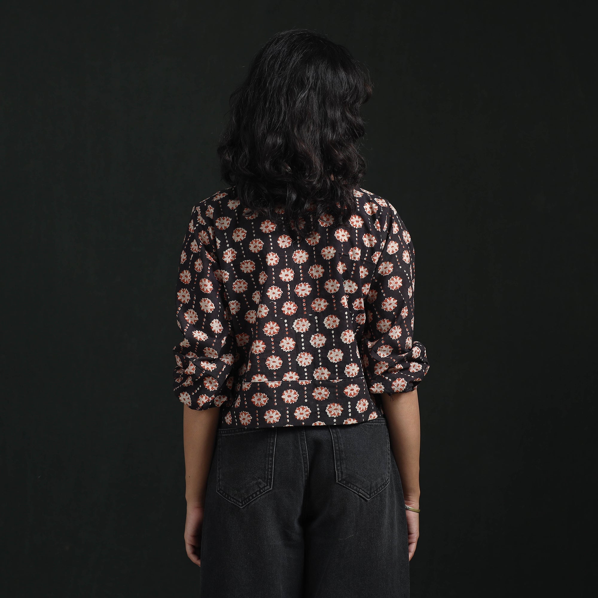 | Material | Black sanganeri hand block print pure cotton women’s floral crop top featuring a front button placket and full sleeves. This traditional craft from Rajasthan has been practiced for over 500 years. It showcases delicate floral motifs printed with hand-carved wooden blocks and bleed-free VAT dyes. The breathable fabric ensures all-day comfort and pairs beautifully with skirts or pants. |