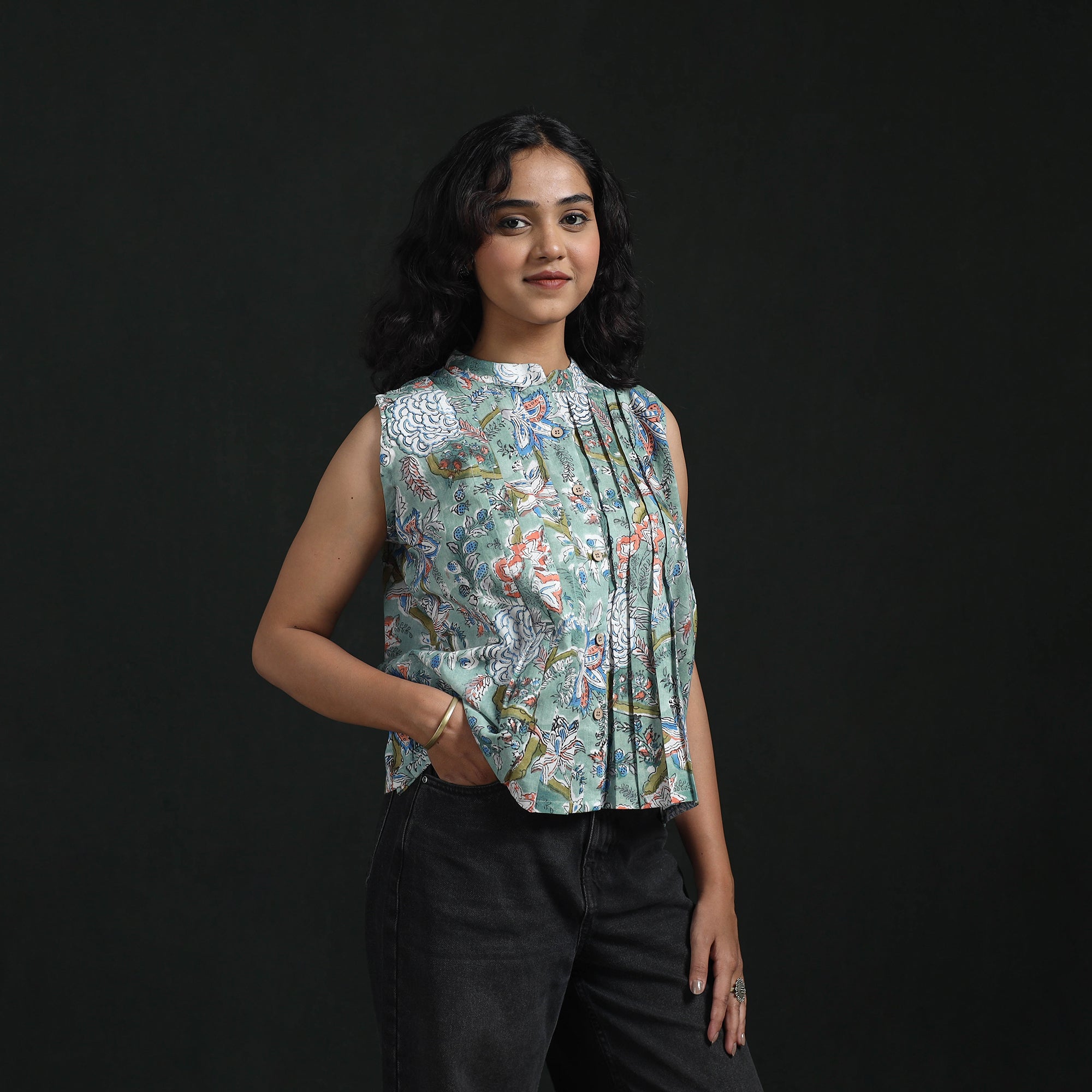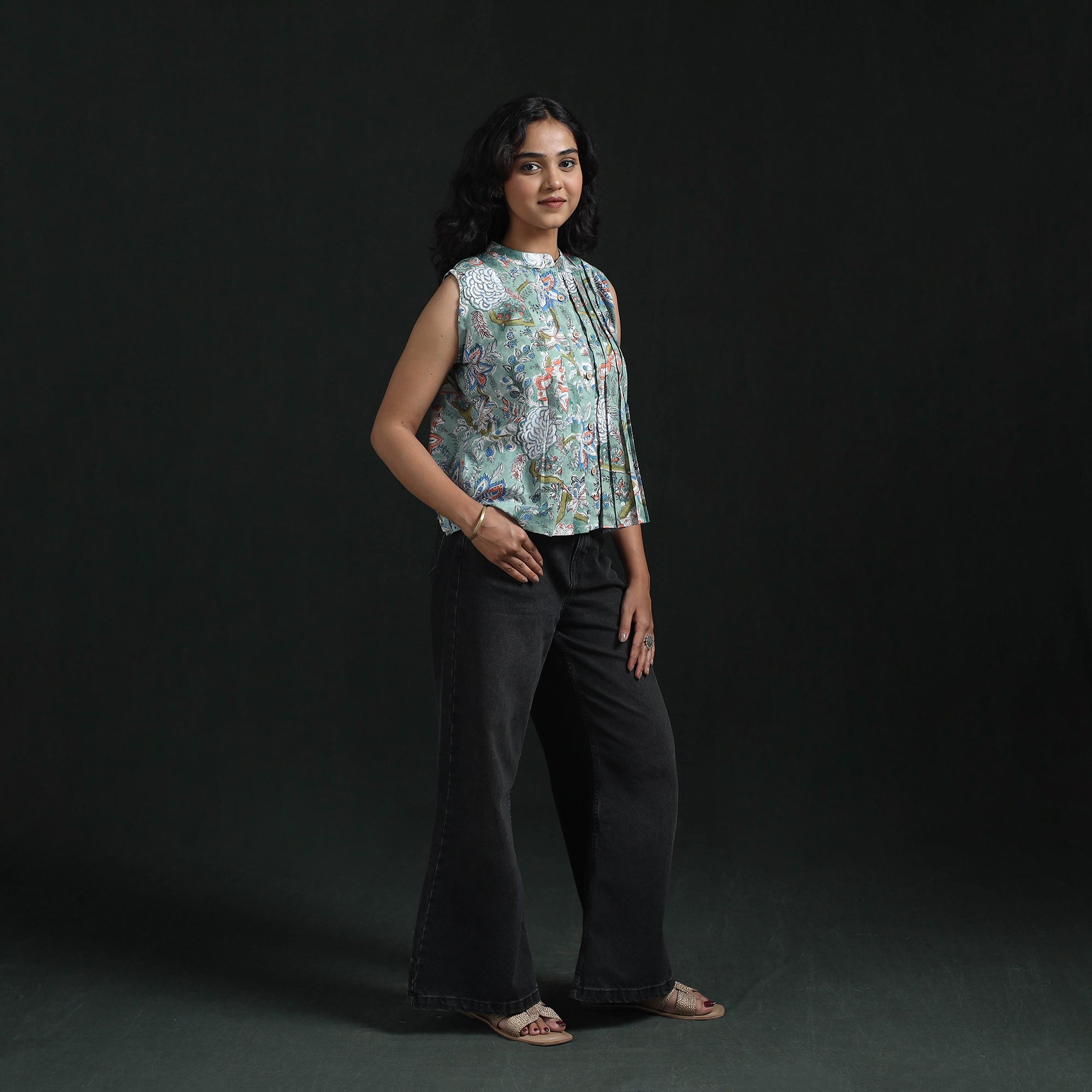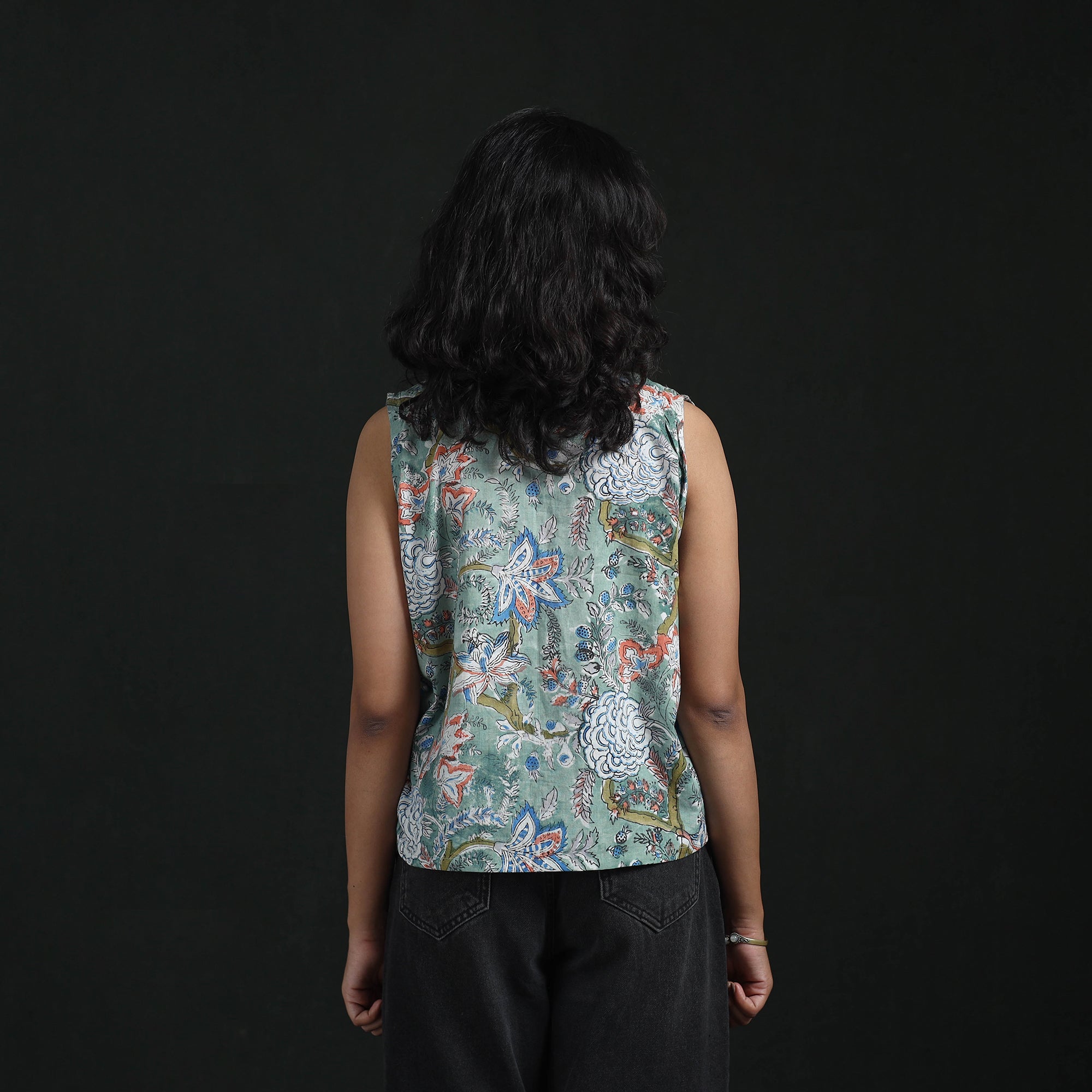 | Material | Green sanganeri hand block print pure cotton sleeveless women’s floral crop top featuring a front button detailing. This traditional craft from Rajasthan has been practiced for over 500 years. It showcases delicate floral motifs printed with hand-carved wooden blocks and bleed-free VAT dyes. The breathable fabric ensures all-day comfort and pairs beautifully with skirts or pants. |