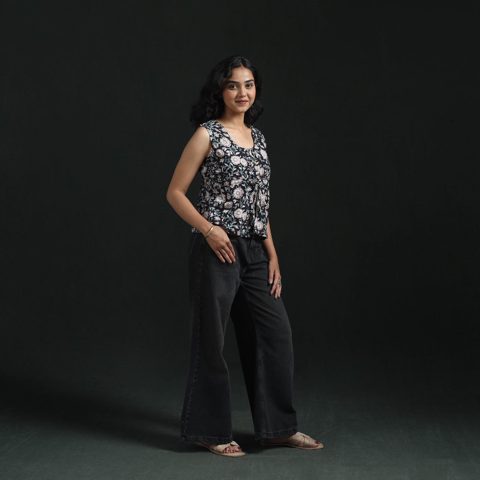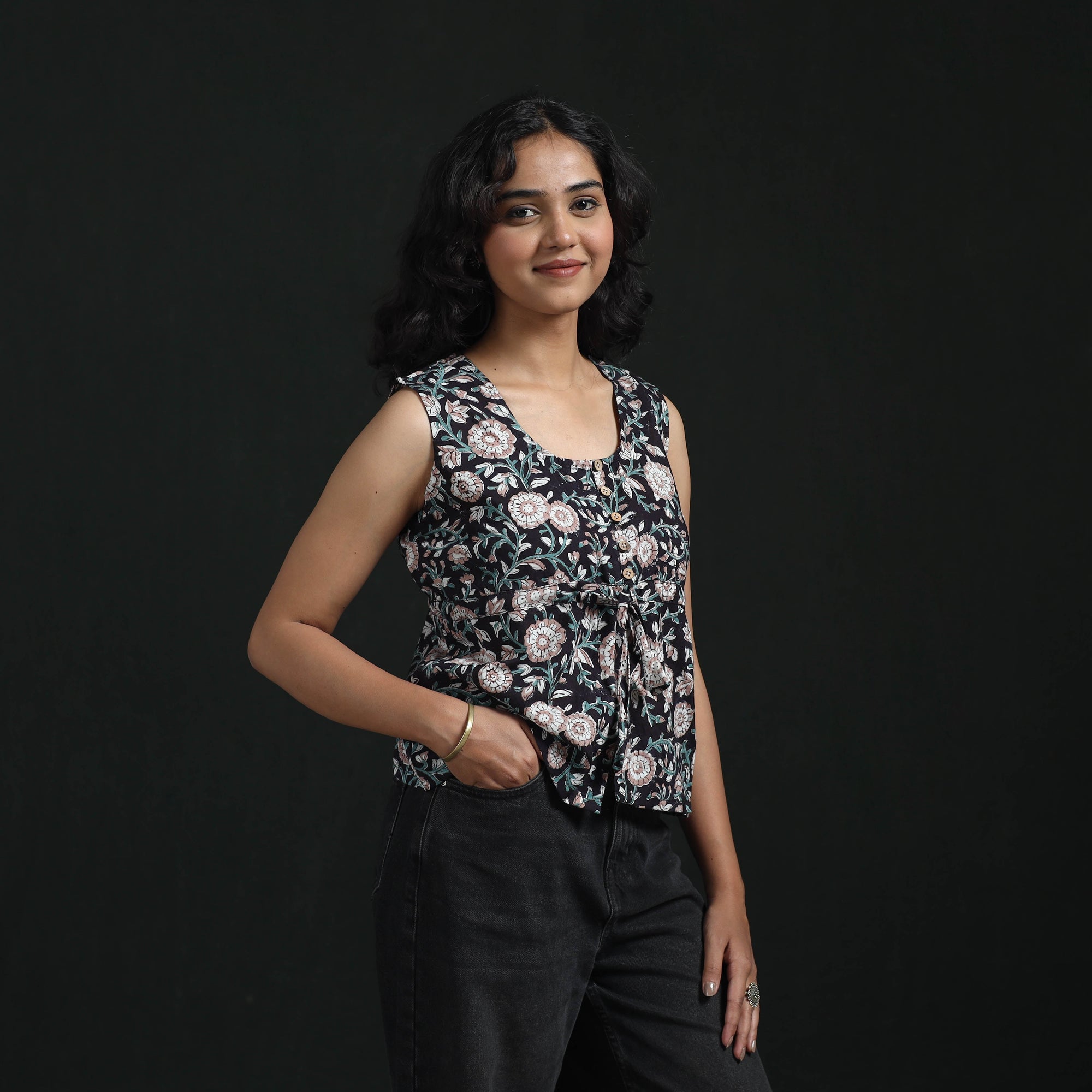 | Material | Black sanganeri hand block print pure cotton sleeveless women’s floral crop top featuring front button detailing and a drawstring waist tie for an adjustable and comfortable fit. This traditional craft from Rajasthan has been practiced for over 500 years. It showcases delicate floral motifs printed with hand-carved wooden blocks and bleed-free VAT dyes. The breathable fabric ensures all-day comfort and pairs beautifully with skirts or pants. |