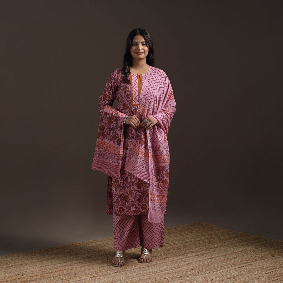 Pure cotton hand embroidered suit set features traditional sanganeri block printing from Rajasthan known for its fine floral patterns. Made using hand carved wooden blocks. Includes straight kurta with side pocket palazzo with elastic waist and pockets and matching mul cotton dupatta. Perfect for both daily wear and special moments, it beautifully combines comfort and charm.