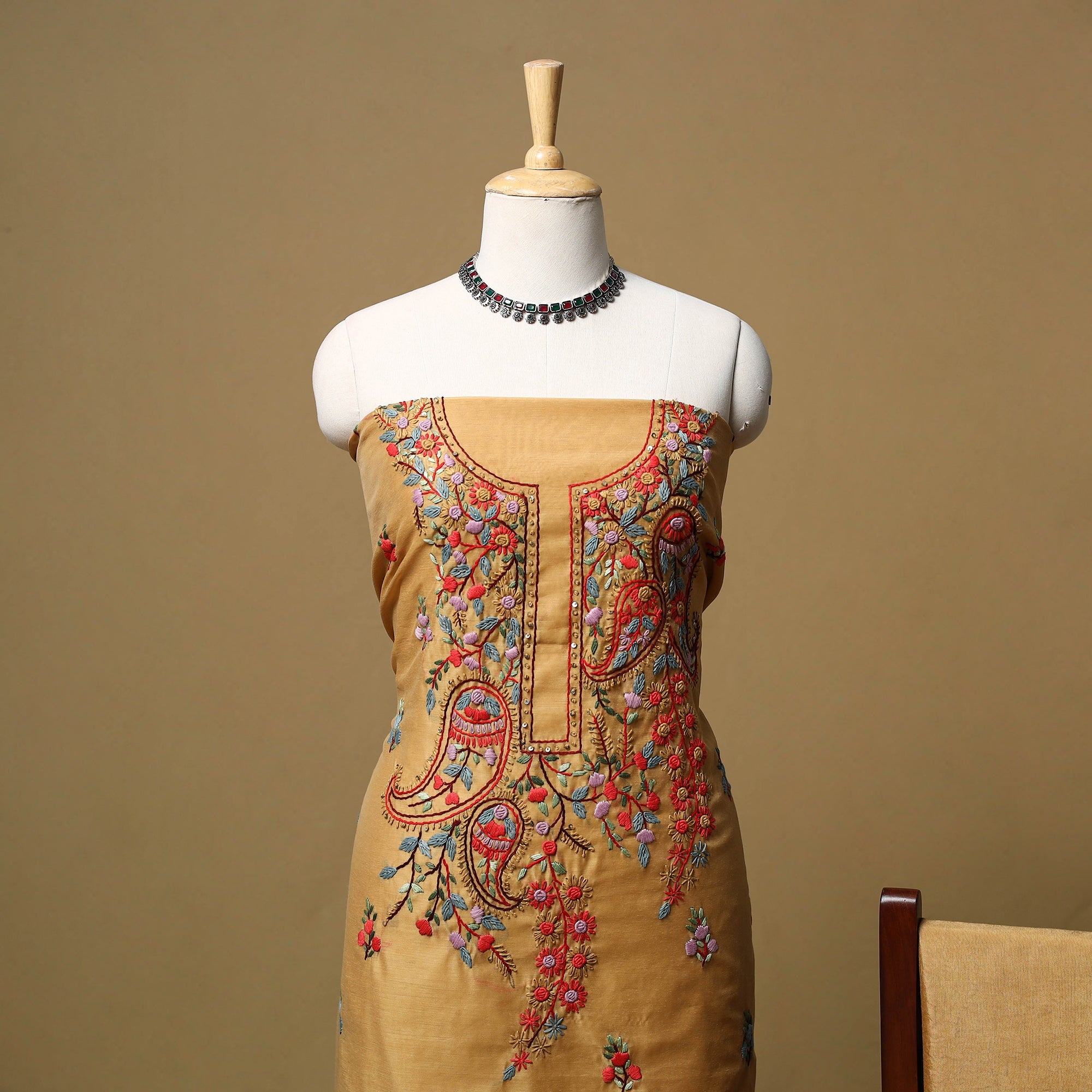 3pc unstitched dress material showcases detailed hand embroidery crafted by skilled artisans from West Bengal. The chanderi silk cotton kurta and dupatta are adorned with fine hand embroidered motifs, creating a rich textured look. It is paired with a plain santoon taffeta bottom that balances the detailed surface work. A refined choice for festive gatherings, family functions and cultural celebrations.
