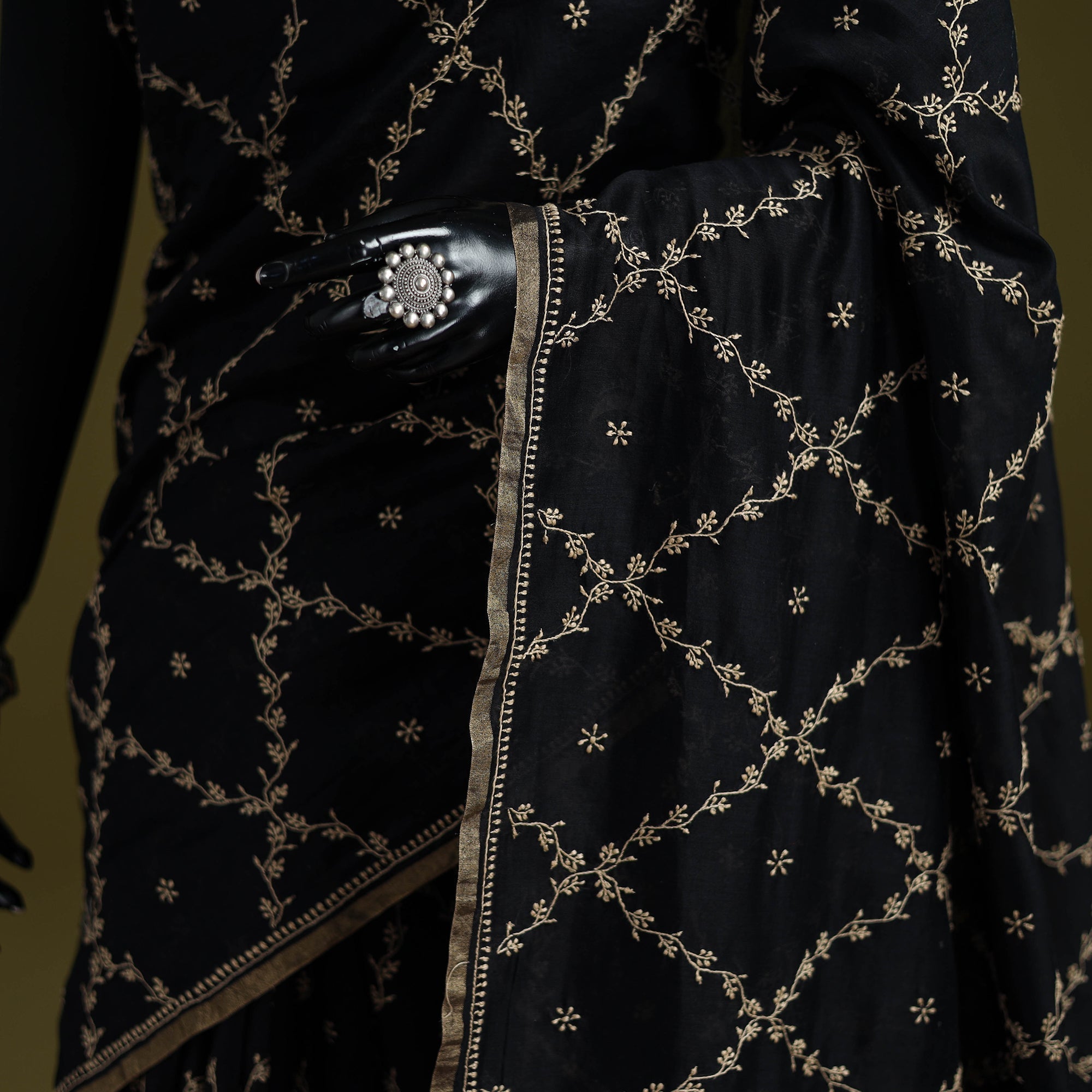 | Material | Traditional black hand embroidered lucknow chikankari saree by Shwet artisans, crafted using a blend of cotton 2/74 and warp chanderi silk 20/22 denier. The saree features nature inspired chikankari motifs created using intricate techniques such as Bakhiya, Phanda, Ghass Patti, and Pachni. Each piece takes several days to complete, following a 400 year old lucknowi embroidery tradition rooted in patience, skill, and detailed handwork. Suitable for daily wear, small gatherings, festive occasions, and cultural events. |