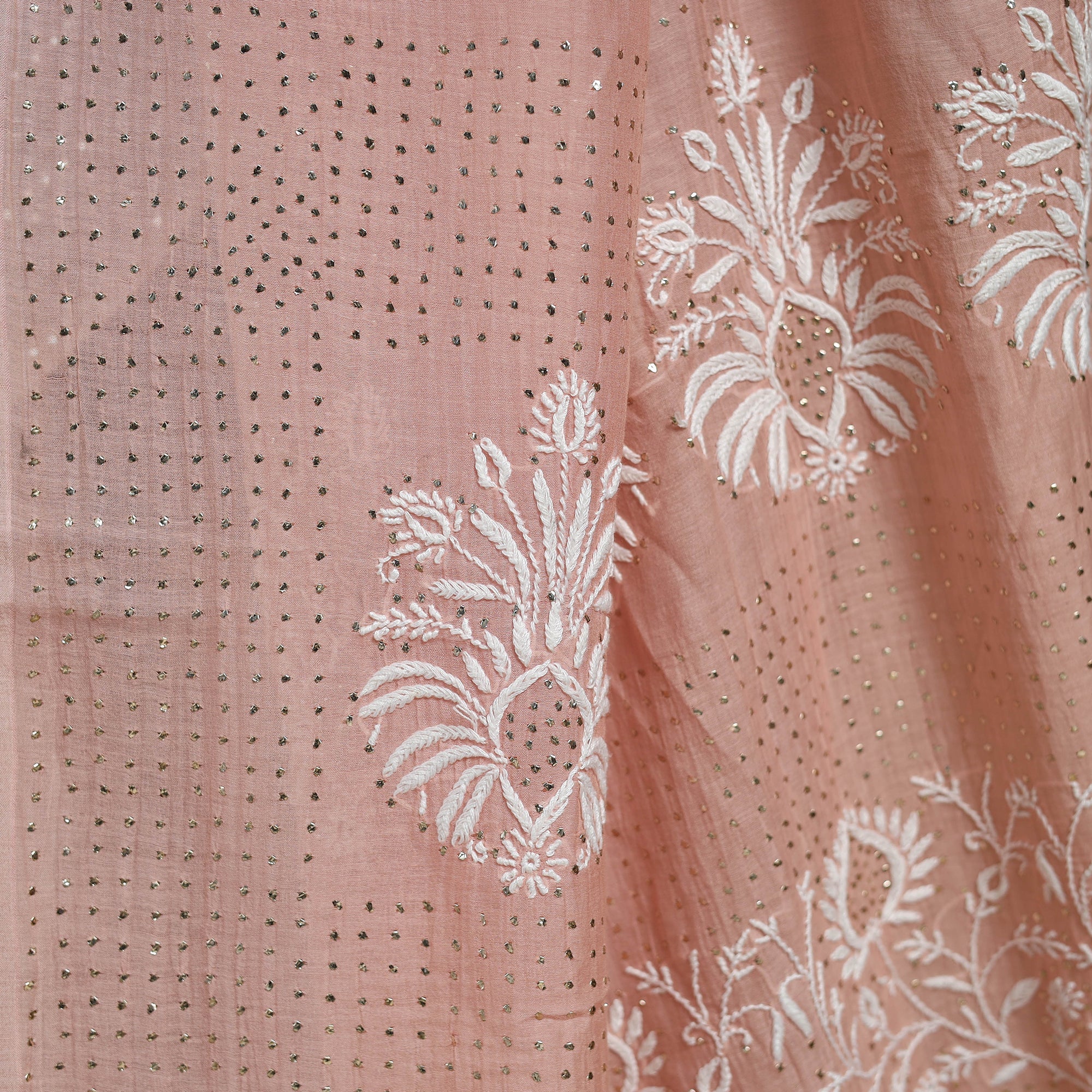 Intricately and artfully crafted, this zari border pink chikankari chanderi silk cotton saree celebrates the heritage handwork of Lucknow, Uttar Pradesh. Known for its delicate thread motifs and subtle elegance, Chikankari features meticulously hand-embroidered designs made with soft pastel threads that form graceful floral and paisley patterns. The saree beautifully blends tradition with artistry, making it perfect for weddings, festive celebrations, cultural gatherings, and elegant evening occasions.
