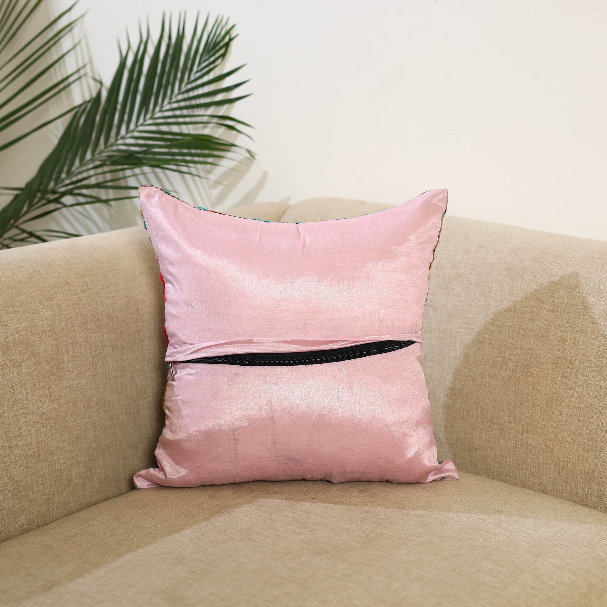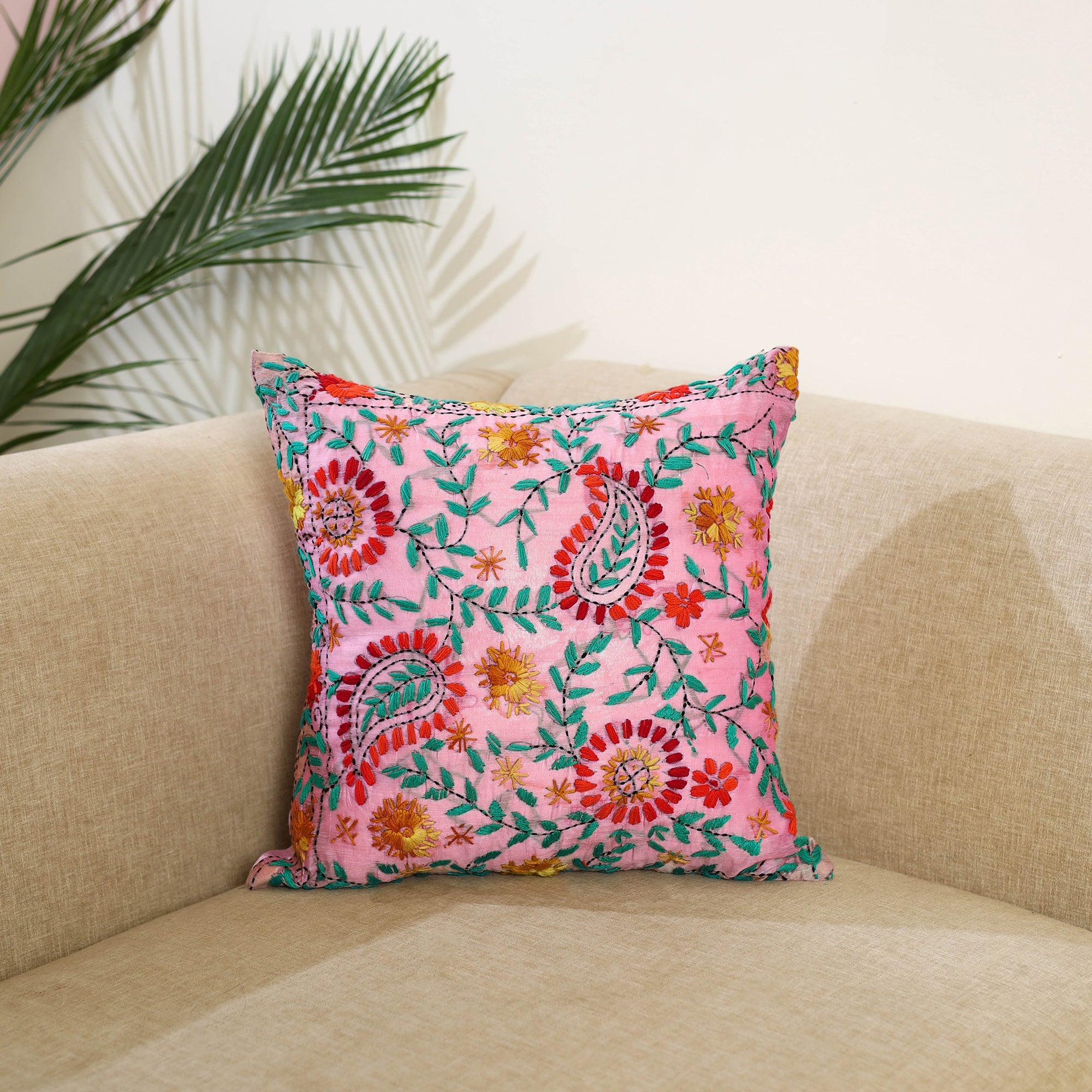 This pink chanderi silk cotton cushion cover features traditional hand embroidery in the ranihati style, known for its detailed and dense threadwork. The fabric has a smooth texture with a gentle sheen, adding a touch of elegance to your space. Perfect for special occasions or to enhance everyday home decor with a hint of tradition.