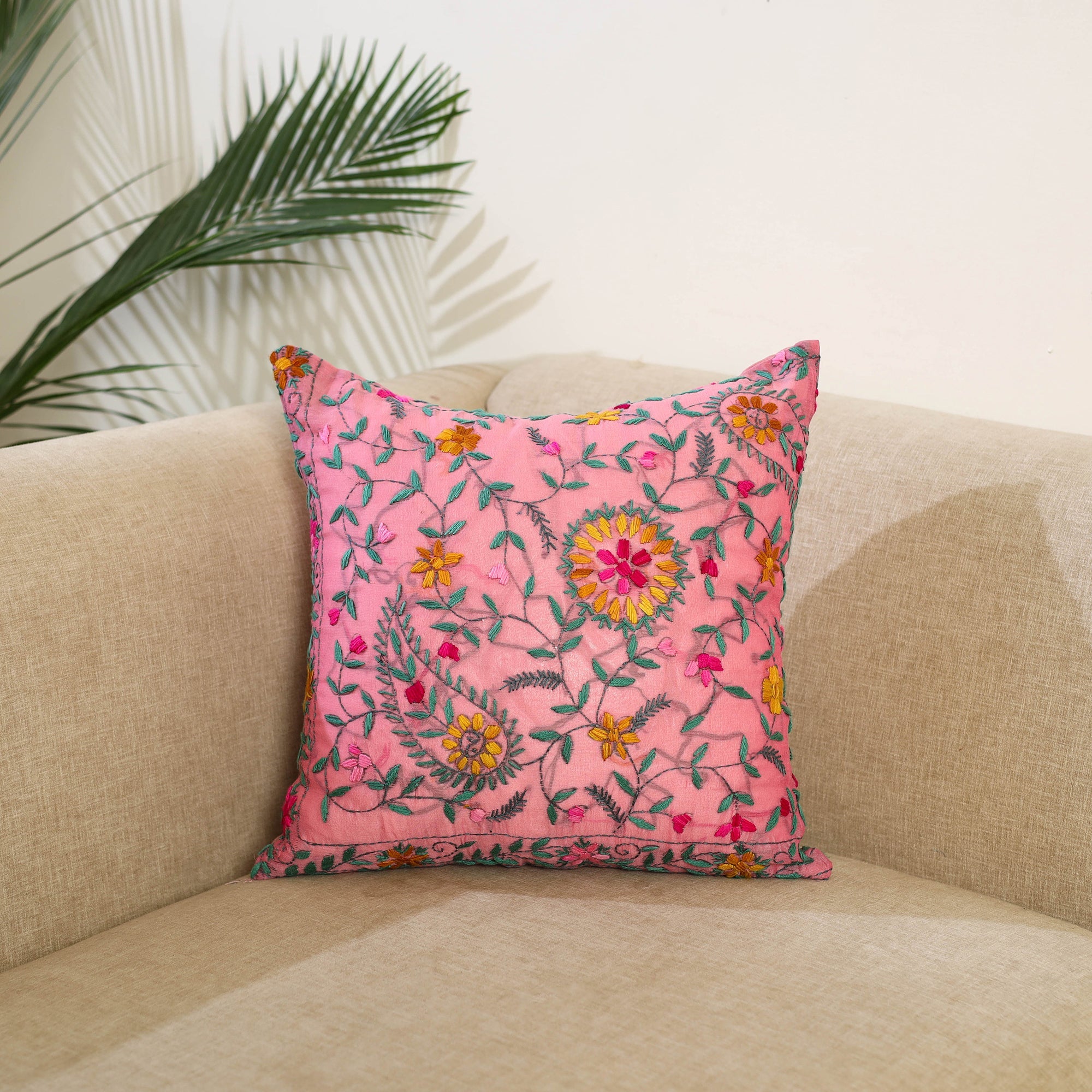This pink chanderi silk cotton cushion cover features traditional hand embroidery in the ranihati style, known for its detailed and dense threadwork. The fabric has a smooth texture with a gentle sheen, adding a touch of elegance to your space. Perfect for special occasions or to enhance everyday home decor with a hint of tradition.