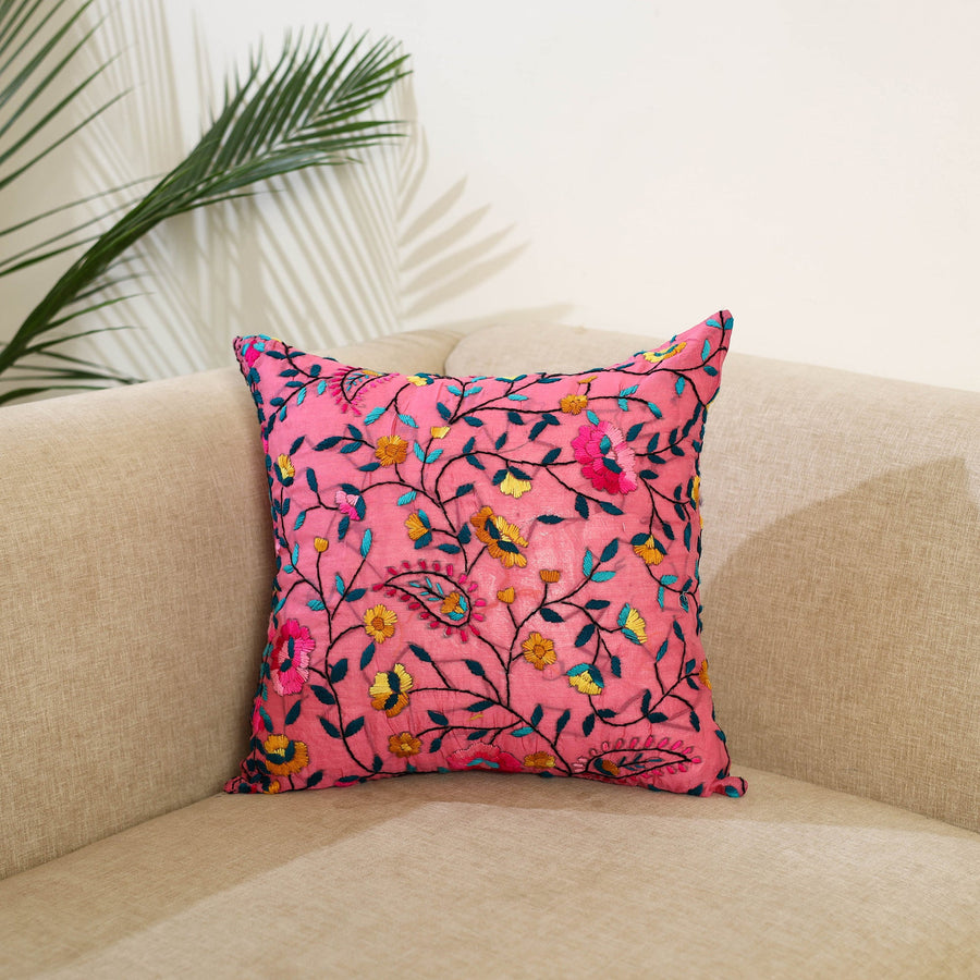 This pink chanderi silk cotton cushion cover features traditional hand embroidery in the ranihati style, known for its detailed and dense threadwork. The fabric has a smooth texture with a gentle sheen, adding a touch of elegance to your space. Perfect for special occasions or to enhance everyday home decor with a hint of tradition.
