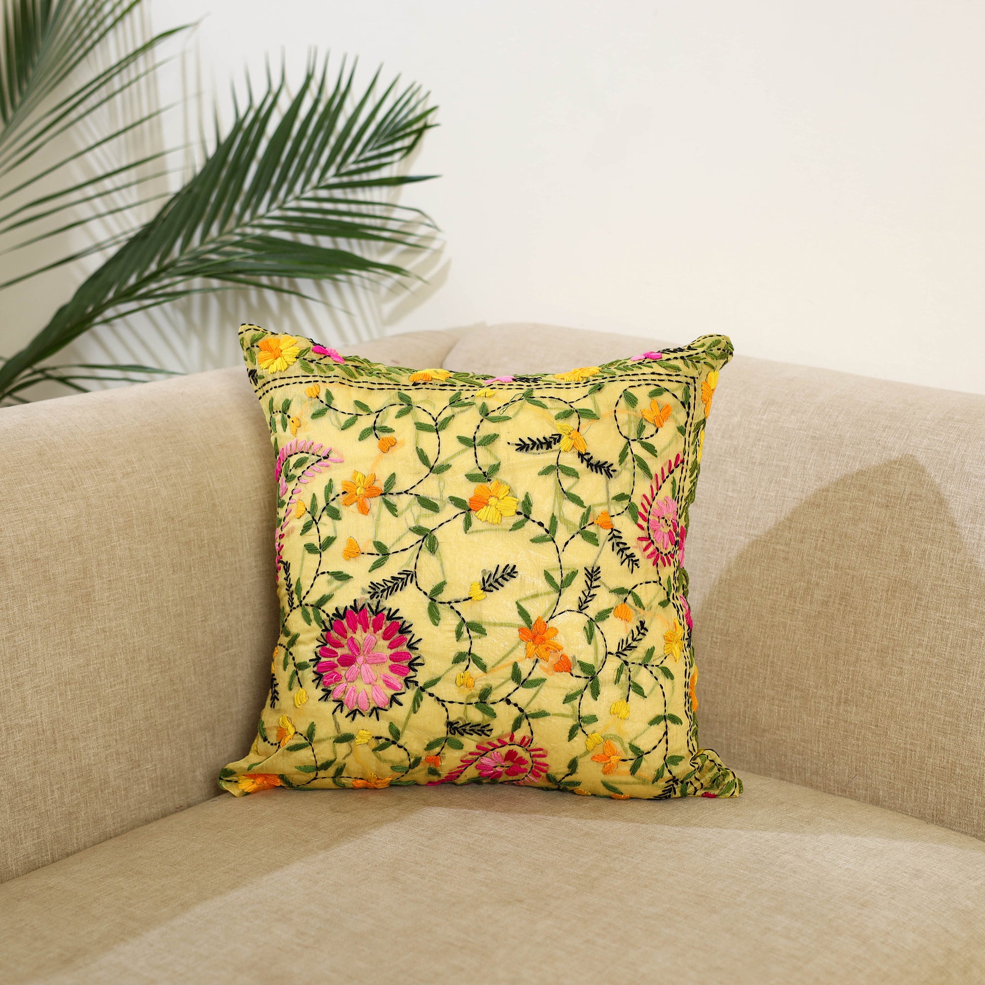 This yellow chanderi silk cotton cushion cover features traditional hand embroidery in the ranihati style, known for its detailed and dense threadwork. The fabric has a smooth texture with a gentle sheen, adding a touch of elegance to your space. Perfect for special occasions or to enhance everyday home decor with a hint of tradition.