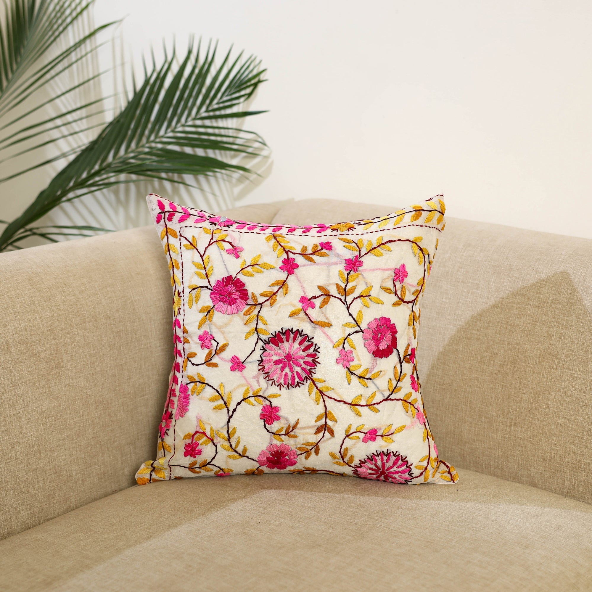 This beige chanderi silk cotton cushion cover features traditional hand embroidery in the ranihati style, known for its detailed and dense threadwork. The fabric has a smooth texture with a gentle sheen, adding a touch of elegance to your space. Perfect for special occasions or to enhance everyday home decor with a hint of tradition.