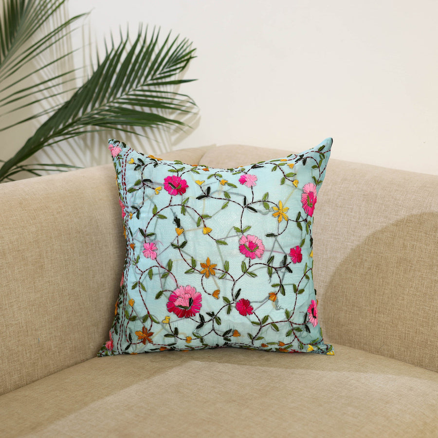 This blue chanderi silk cotton cushion cover features traditional hand embroidery in the ranihati style, known for its detailed and dense threadwork. The fabric has a smooth texture with a gentle sheen, adding a touch of elegance to your space. Perfect for special occasions or to enhance everyday home decor with a hint of tradition.