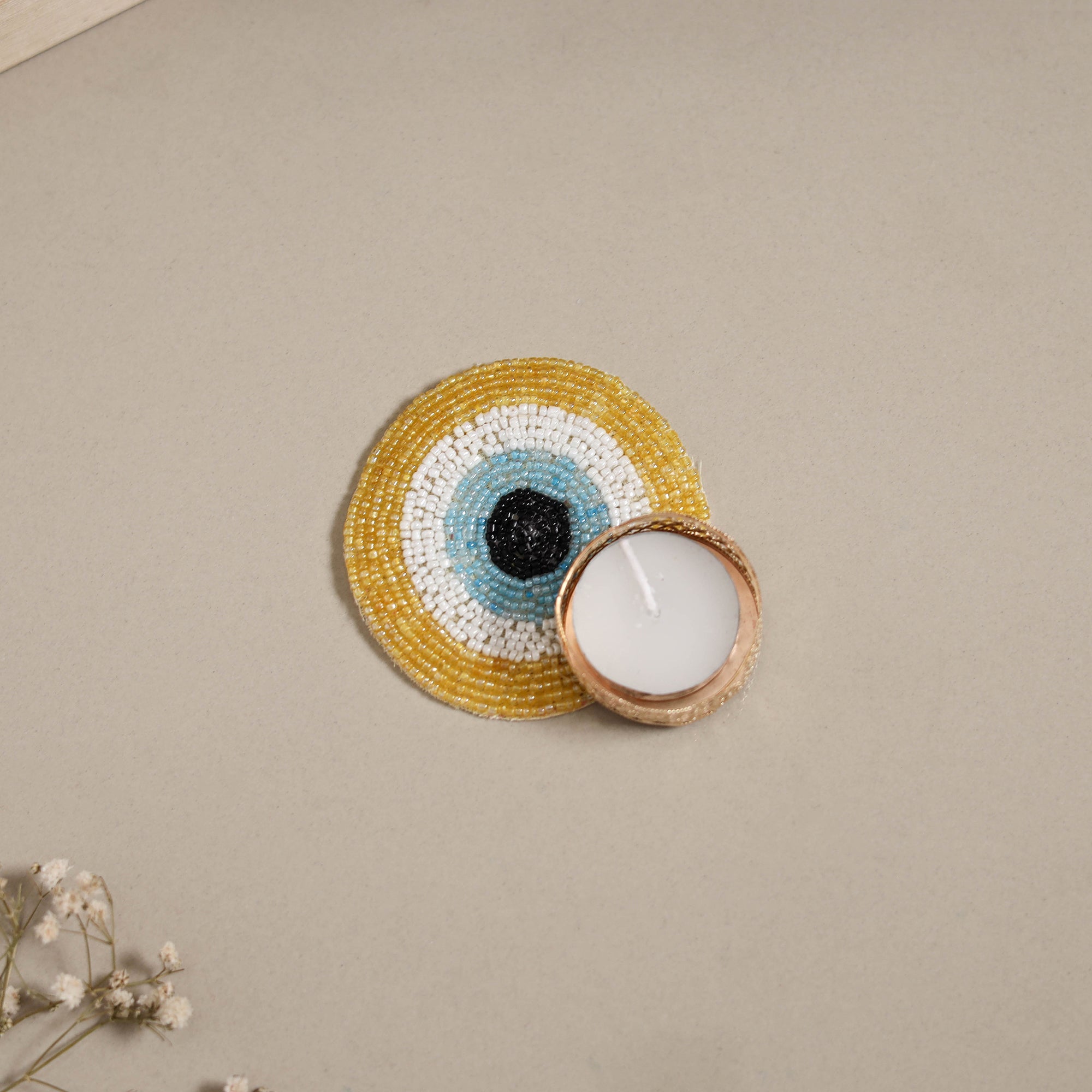 Light up your space with this tealight candle holder, decorated with bead embroidery and an evil eye design. Perfect for festivals, pooja corners, or gifting, it adds a bright and stylish touch to your decor.