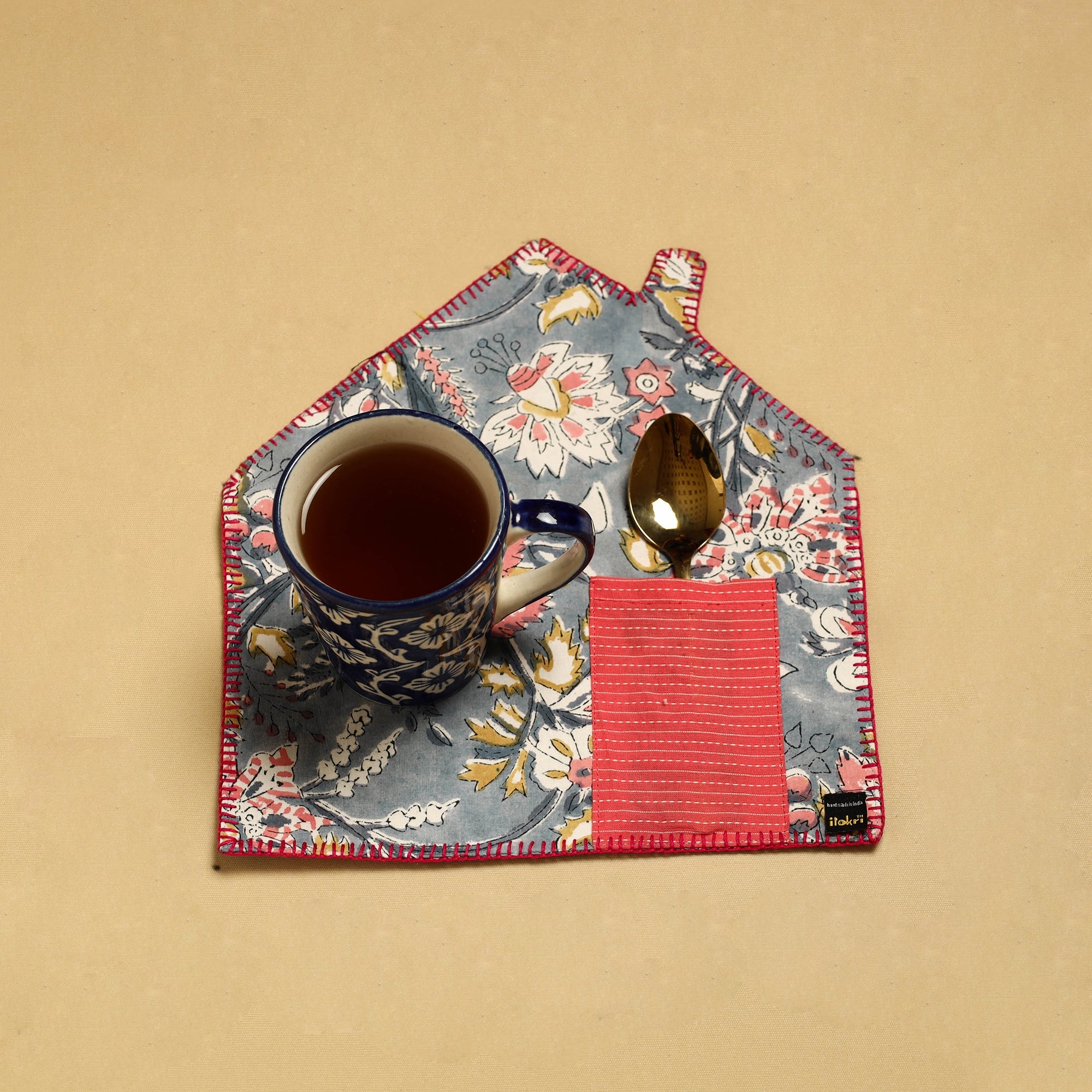 This hand embroidered floral cotton grey pot holder with pocket is a perfect blend of style and functionality. crafted with care, it protects your surfaces from hot pots, making it a must-have for every kitchen. Fashionable and safe to use as potholder or trivets.