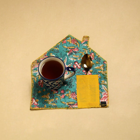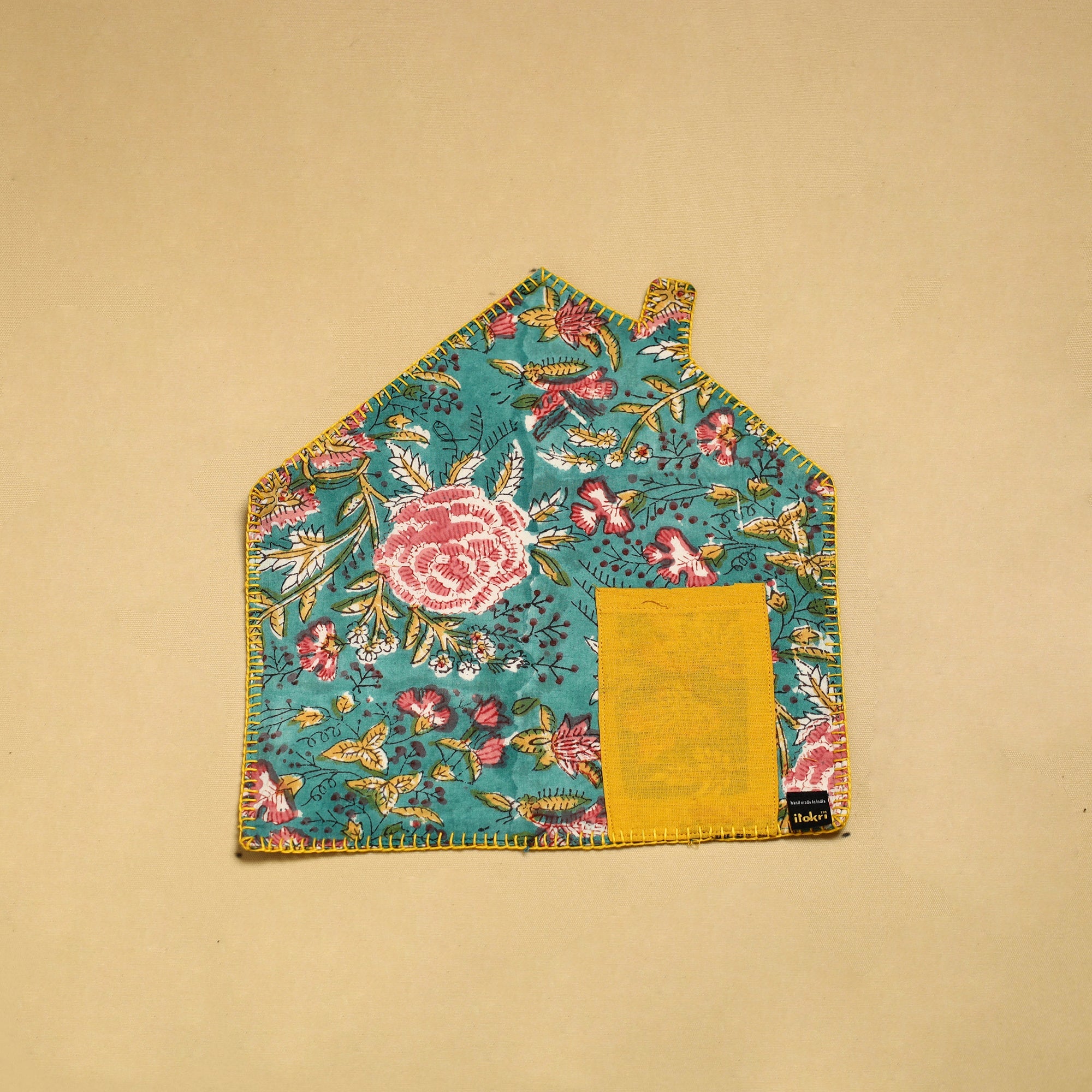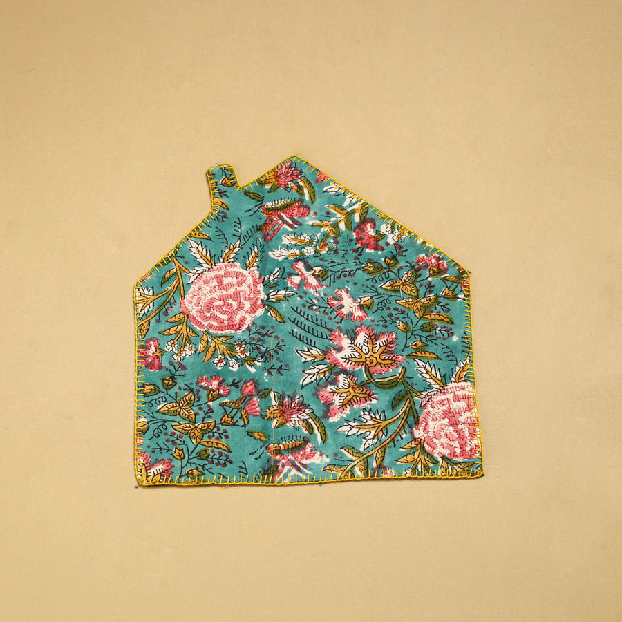 This hand embroidered floral sea green cotton pot holder with pocket is a perfect blend of style and functionality. crafted with care, it protects your surfaces from hot pots, making it a must-have for every kitchen. Fashionable and safe to use as potholder or trivets.