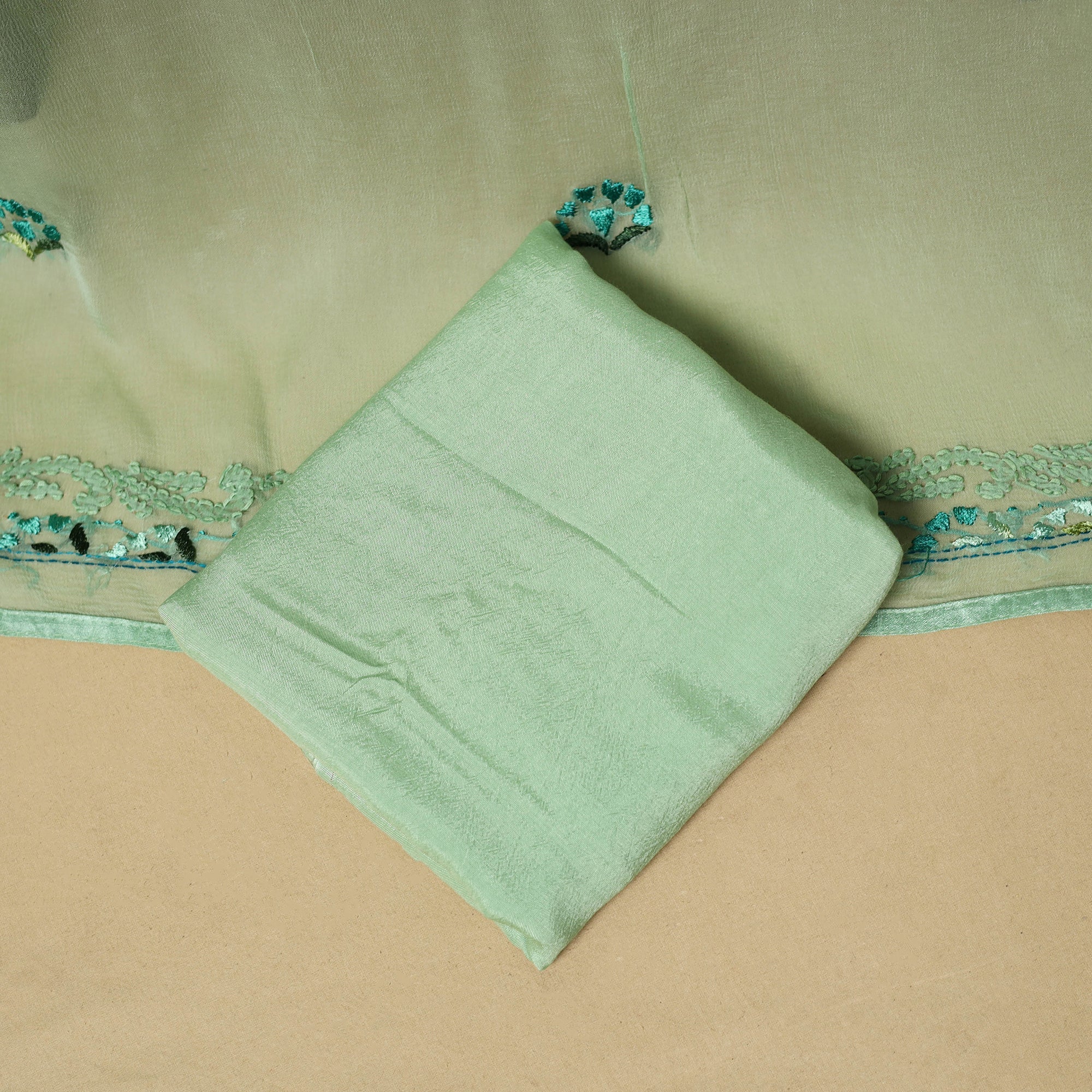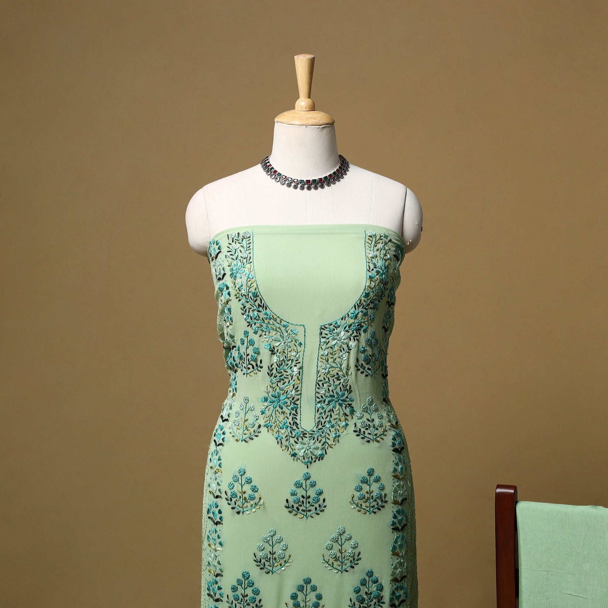 Green 3pc unstitched dress material showcases detailed french knot hand embroidery crafted by skilled artisans from West Bengal. The georgette viscose blend kurta and chiffon viscose dupatta are adorned with fine hand embroidered motifs, creating a rich textured look. It is paired with a plain santoon taffeta bottom that balances the detailed surface work. A refined choice for festive gatherings, family functions and cultural celebrations.