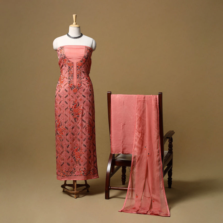 Pink 3pc unstitched dress material showcases detailed french knot hand embroidery crafted by skilled artisans from West Bengal. The georgette viscose blend kurta and chiffon viscose dupatta are adorned with fine hand embroidered motifs, creating a rich textured look. It is paired with a plain santoon taffeta bottom that balances the detailed surface work. A refined choice for festive gatherings, family functions and cultural celebrations.