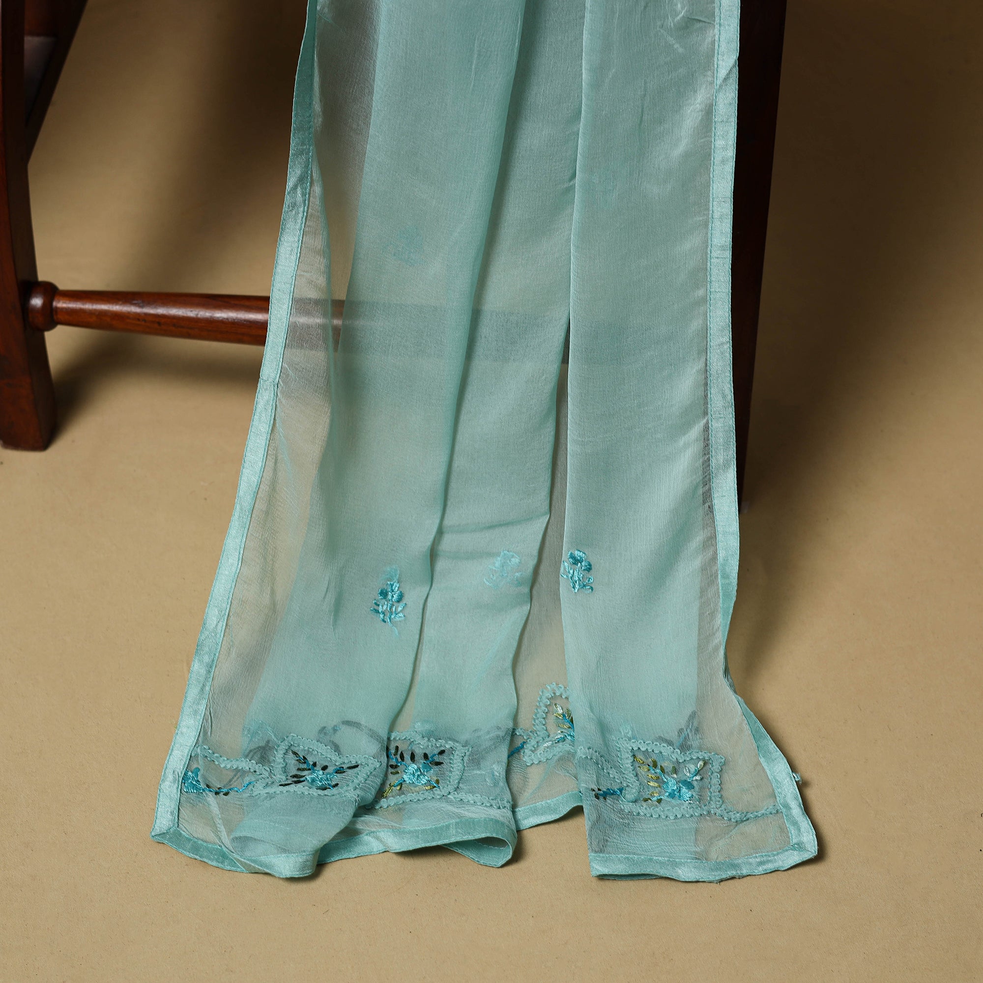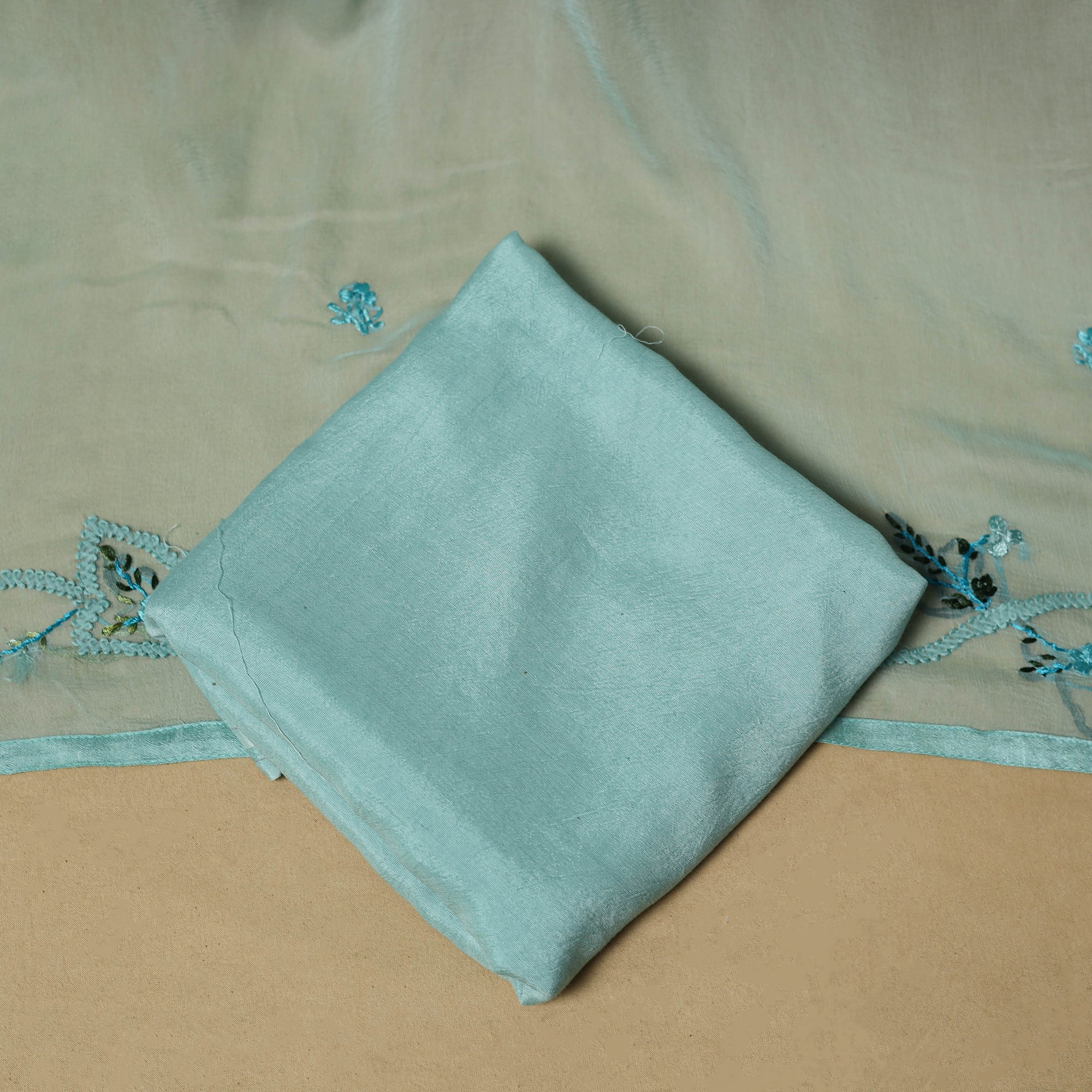 Blue 3pc unstitched dress material showcases detailed french knot hand embroidery crafted by skilled artisans from West Bengal. The georgette viscose blend kurta and chiffon viscose dupatta are adorned with fine hand embroidered motifs, creating a rich textured look. It is paired with a plain santoon taffeta bottom that balances the detailed surface work. A refined choice for festive gatherings, family functions and cultural celebrations.
