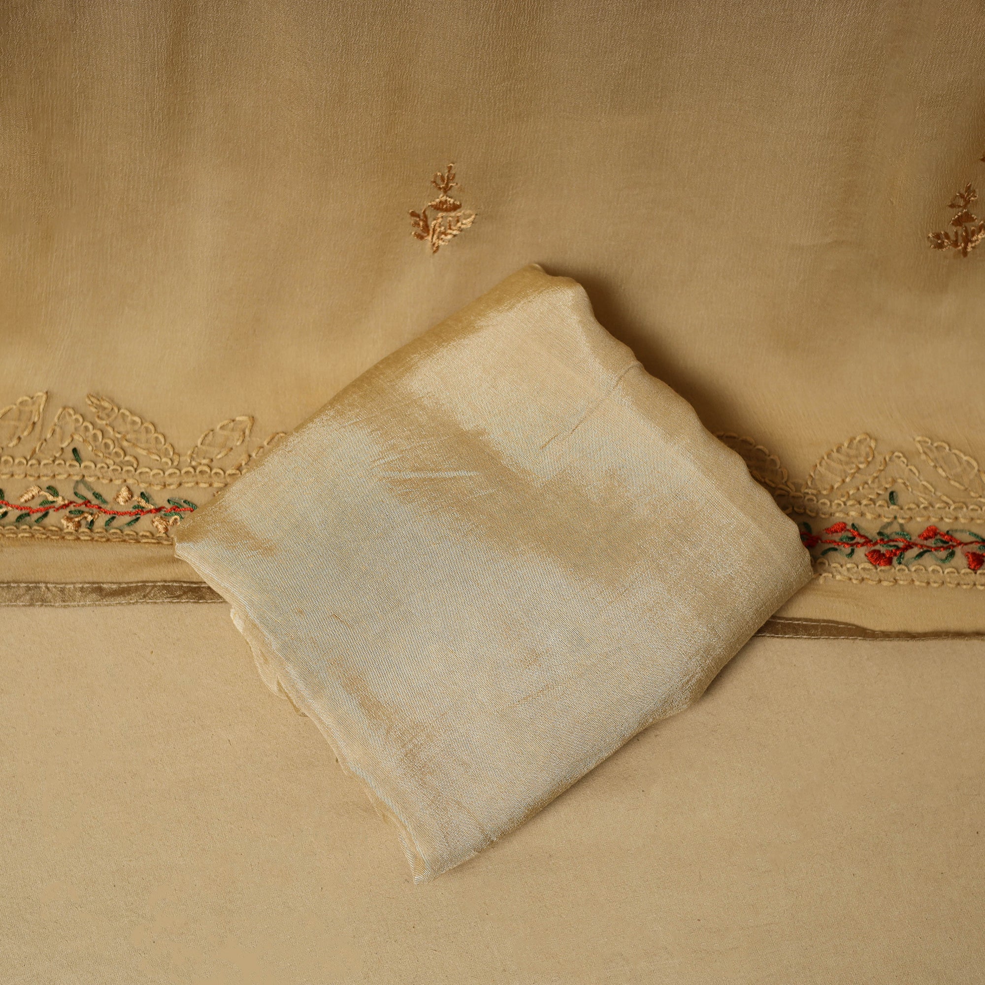 3pc unstitched dress material showcases detailed french knot hand embroidery crafted by skilled artisans from West Bengal. The georgette viscose blend kurta and chiffon viscose dupatta are adorned with fine hand embroidered motifs, creating a rich textured look. It is paired with a plain santoon taffeta bottom that balances the detailed surface work. A refined choice for festive gatherings, family functions and cultural celebrations.