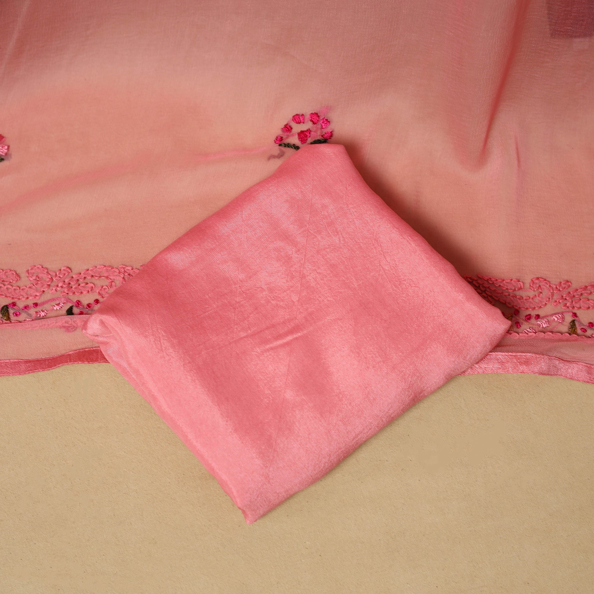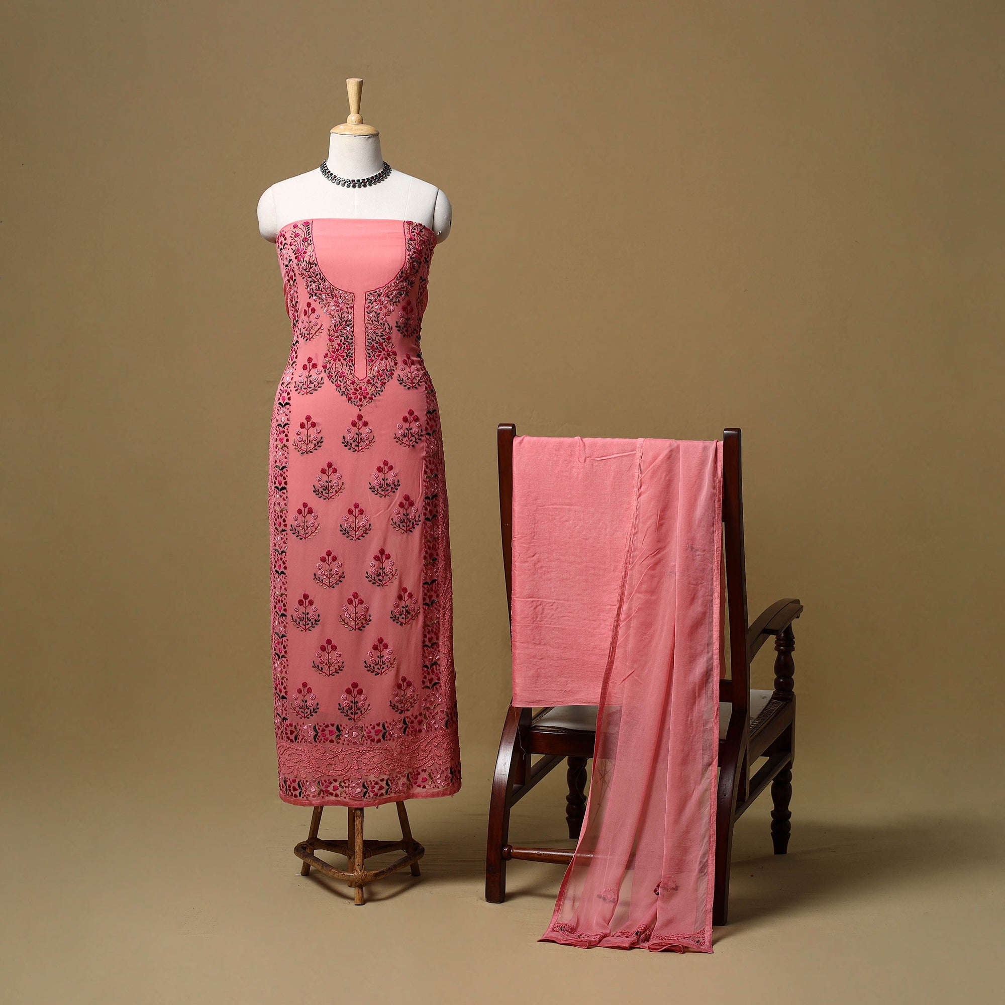 3pc unstitched dress material showcases detailed french knot hand embroidery crafted by skilled artisans from West Bengal. The georgette viscose blend kurta and chiffon viscose dupatta are adorned with fine hand embroidered motifs, creating a rich textured look. It is paired with a plain santoon taffeta bottom that balances the detailed surface work. A refined choice for festive gatherings, family functions and cultural celebrations.
