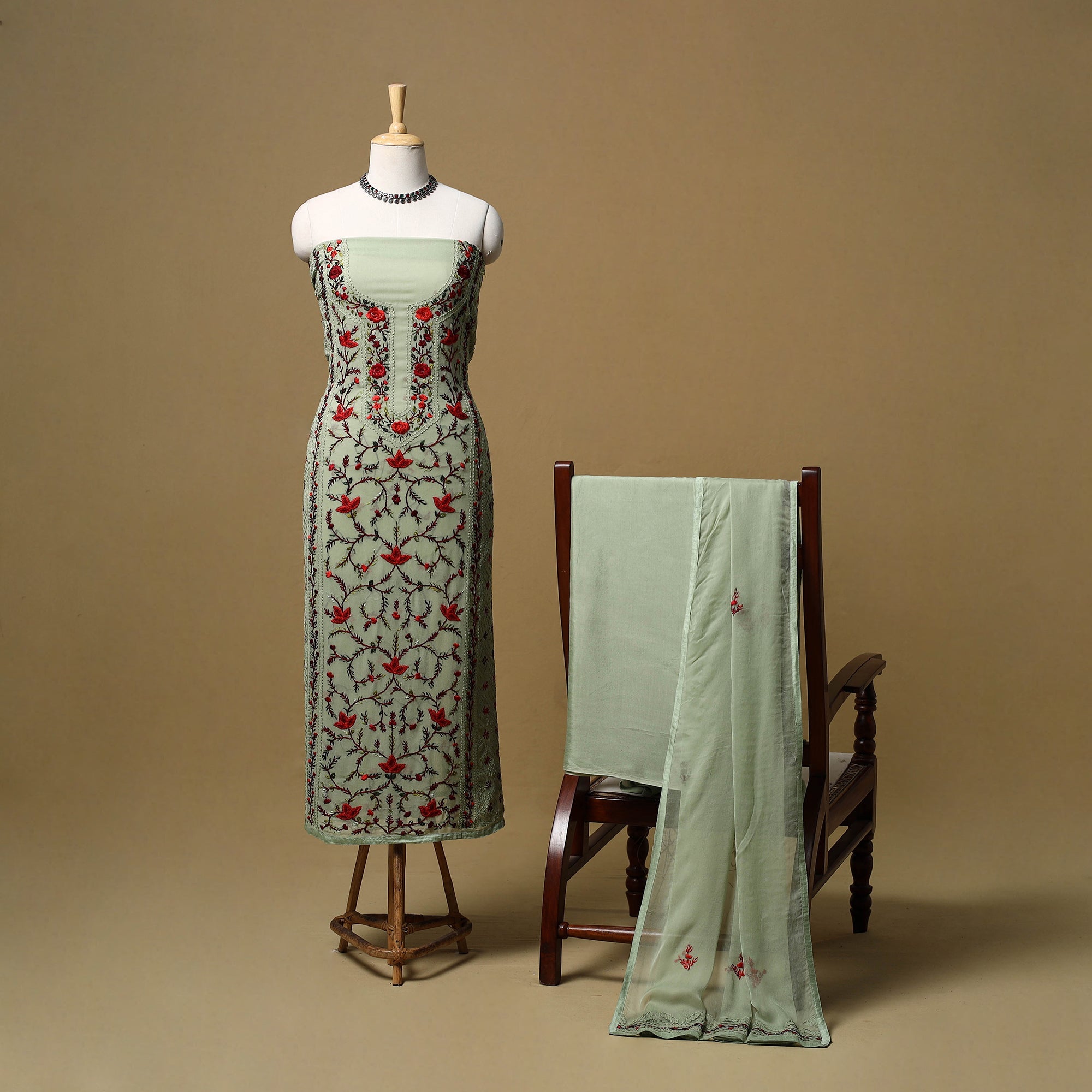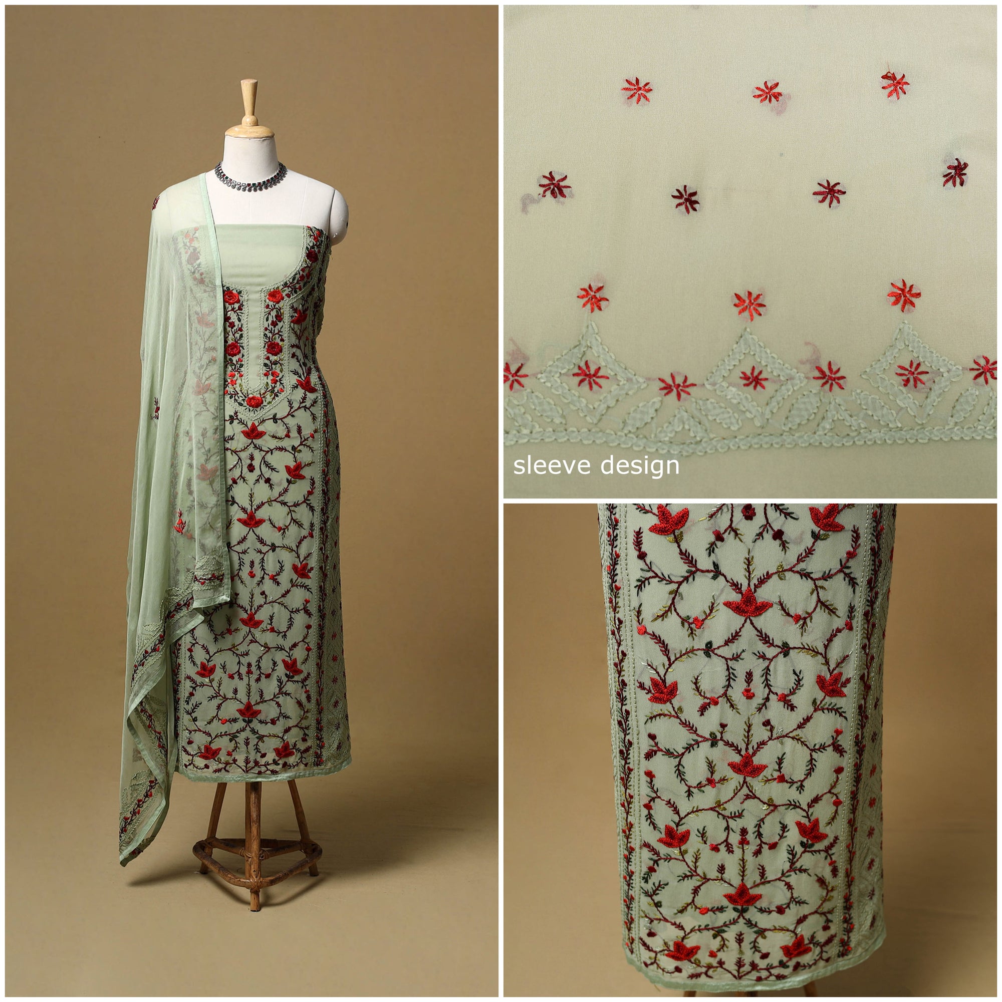 3pc unstitched dress material showcases detailed french knot hand embroidery crafted by skilled artisans from West Bengal. The georgette viscose blend kurta and chiffon viscose dupatta are adorned with fine hand embroidered motifs, creating a rich textured look. It is paired with a plain santoon taffeta bottom that balances the detailed surface work. A refined choice for festive gatherings, family functions and cultural celebrations.