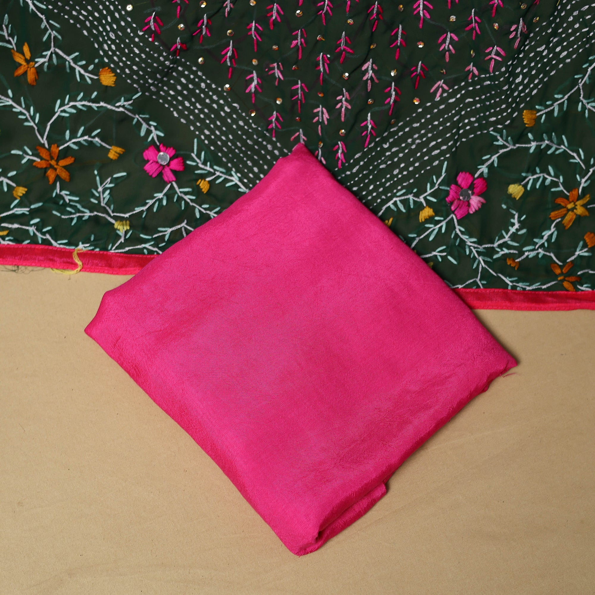 3pc unstitched dress material showcases detailed hand embroidery crafted by skilled artisans from West Bengal. The georgette viscose blend kurta and dupatta are adorned with fine hand embroidered motifs, creating a rich textured look. It is paired with a plain santoon taffeta bottom that balances the detailed surface work. A refined choice for festive gatherings, family functions and cultural celebrations.