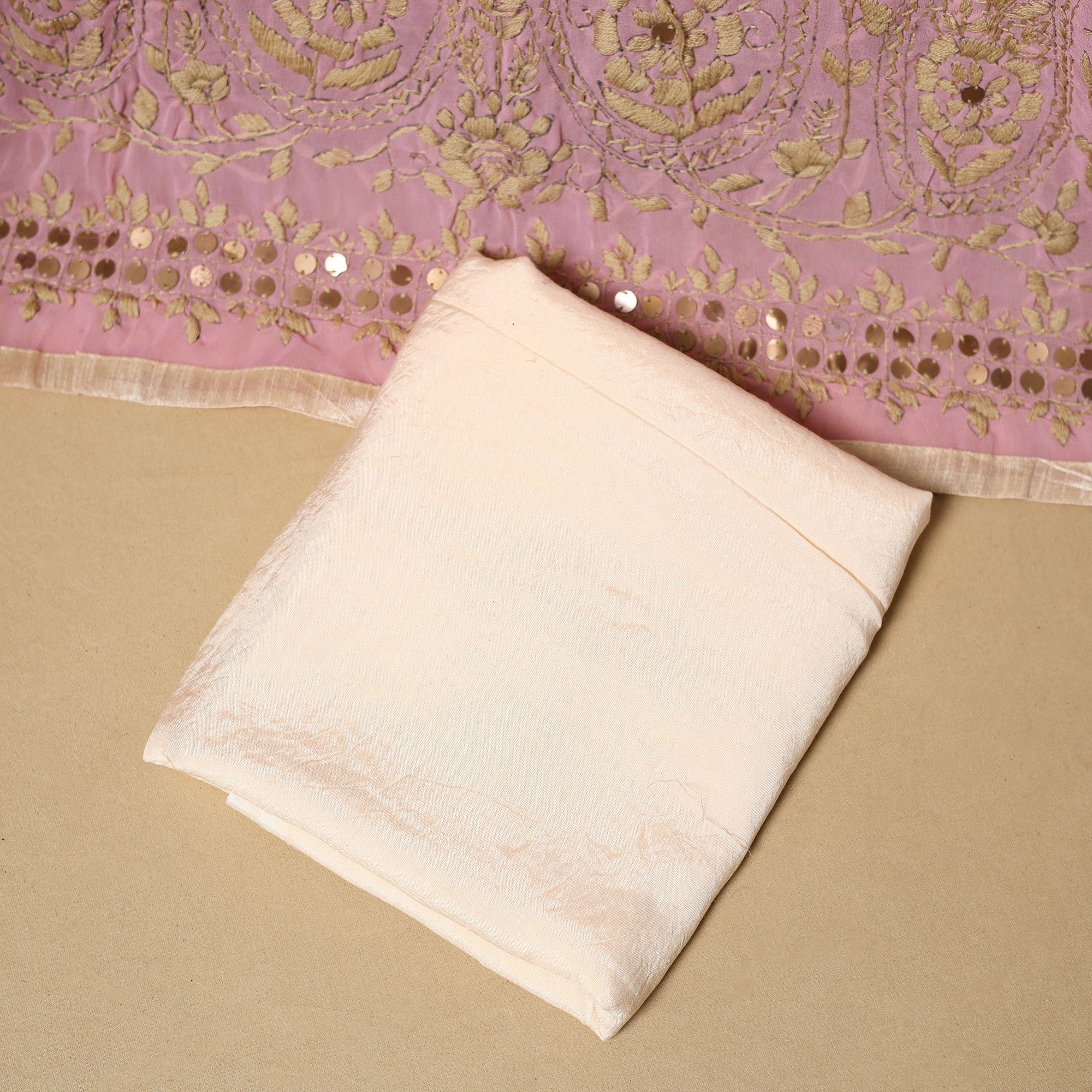 3pc unstitched dress material showcases detailed hand embroidery crafted by skilled artisans from West Bengal. The georgette viscose blend kurta and dupatta are adorned with fine hand embroidered motifs, creating a rich textured look. It is paired with a plain santoon taffeta bottom that balances the detailed surface work. A refined choice for festive gatherings, family functions and cultural celebrations.