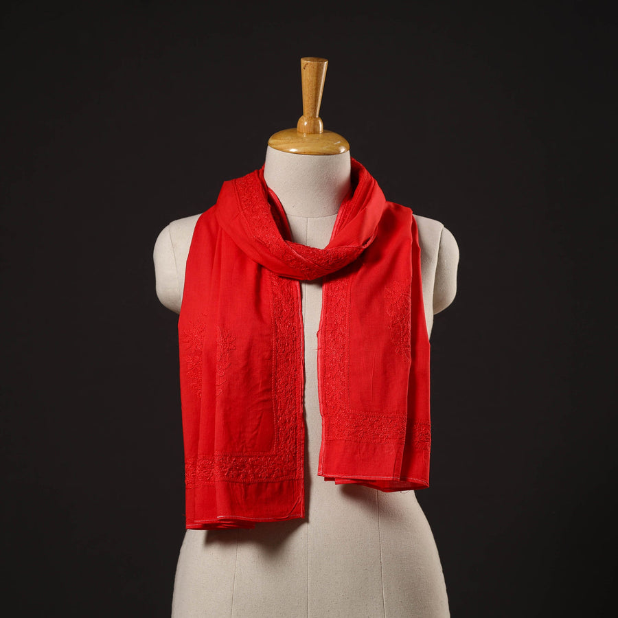 Artfully done red hand embroidered lucknow chikankari cotton stole. Chikankari is a traditional textile decorative from Lucknow. It is very delicate and intricate hand embroidery work where thread is embroidered on cool, pastel shades of light cotton garments.