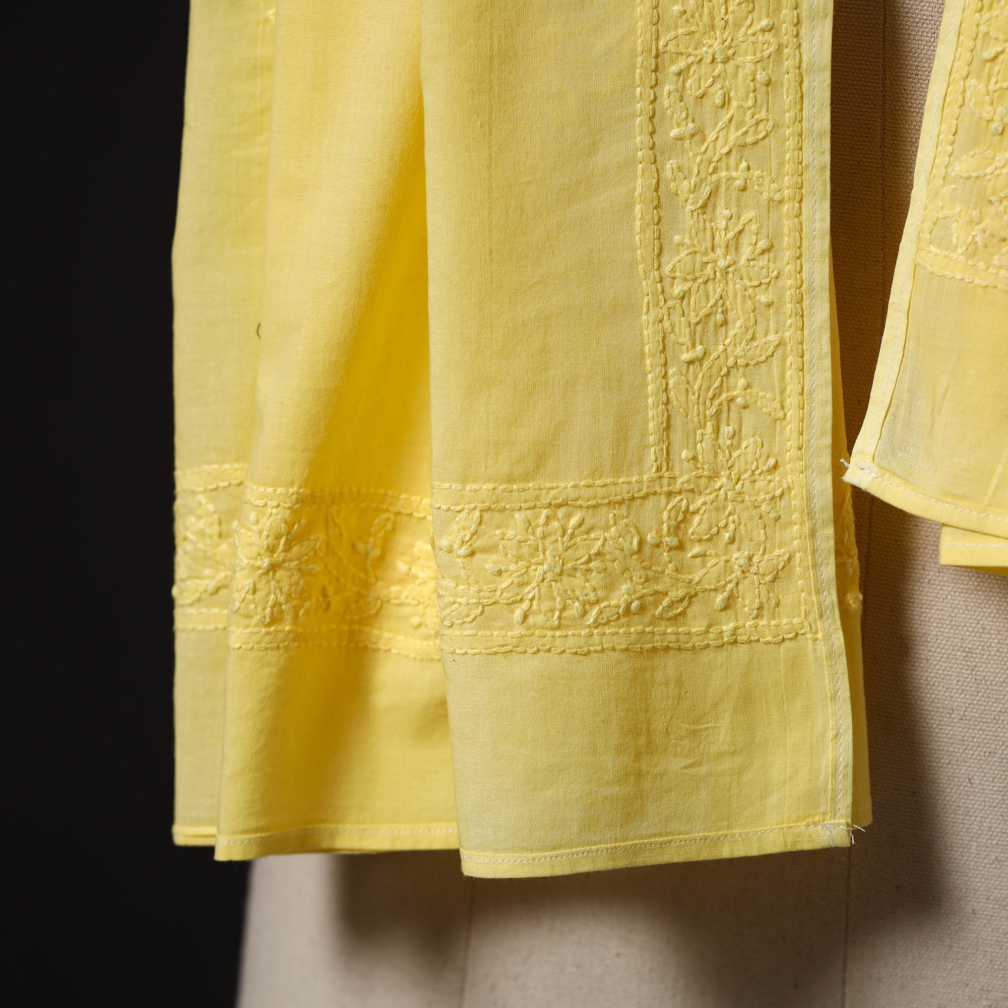 Material Artfully done yellow hand embroidered lucknow chikankari cotton stole. Chikankari is a traditional textile decorative from Lucknow. It is very delicate and intricate hand embroidery work where thread is embroidered on cool, pastel shades of light cotton garments.
