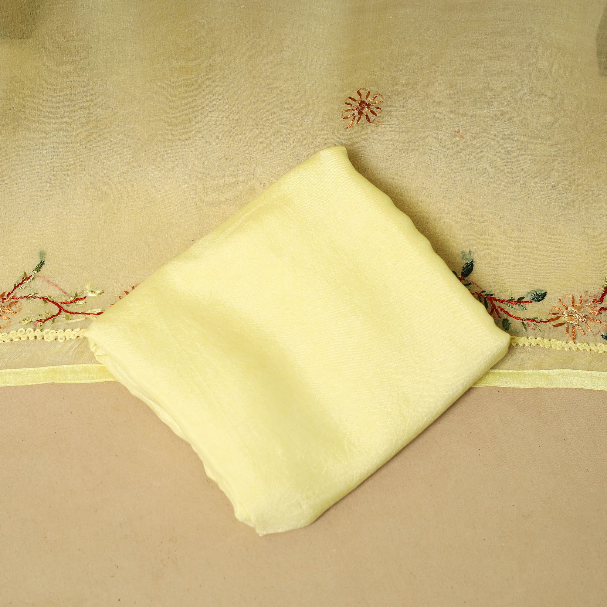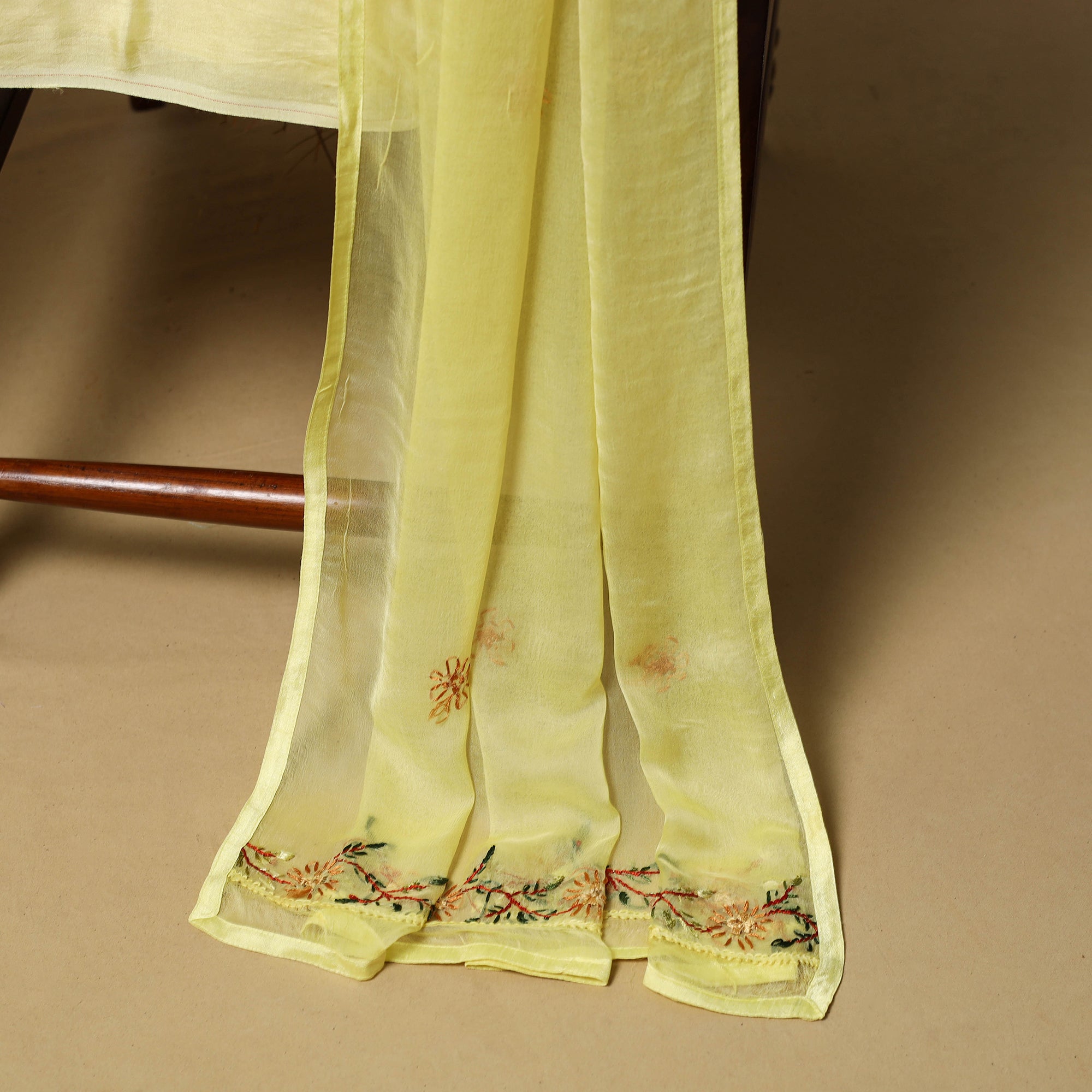3pc unstitched dress material showcases detailed french knot hand embroidery crafted by skilled artisans from West Bengal. The muslin silk viscose blend kurta and chiffon viscose dupatta are adorned with fine hand embroidered motifs, creating a rich textured look. It is paired with a plain santoon taffeta bottom that balances the detailed surface work. A refined choice for festive gatherings, family functions and cultural celebrations.