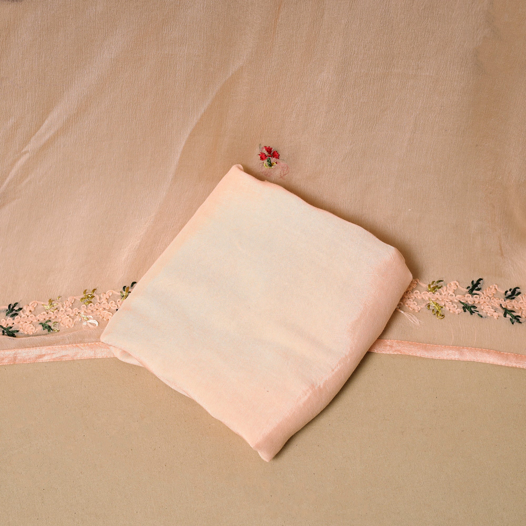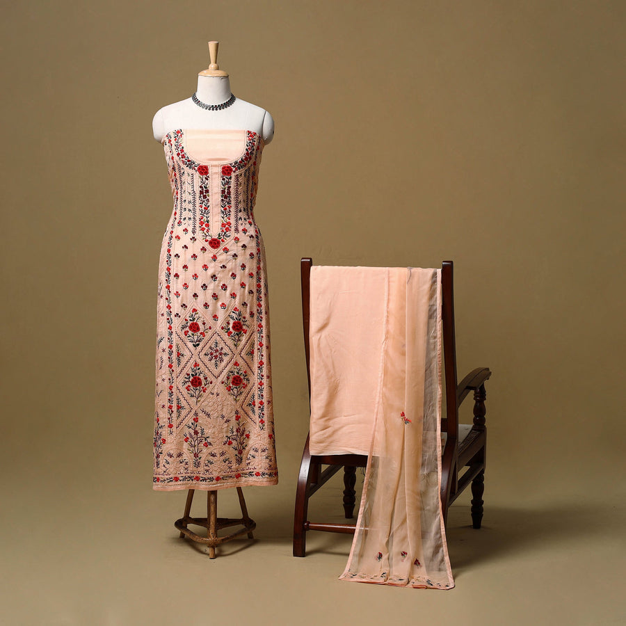 3pc unstitched dress material showcases detailed french knot hand embroidery crafted by skilled artisans from West Bengal. The muslin silk viscose blend kurta and chiffon viscose dupatta are adorned with fine hand embroidered motifs, creating a rich textured look. It is paired with a plain santoon taffeta bottom that balances the detailed surface work. A refined choice for festive gatherings, family functions and cultural celebrations.
