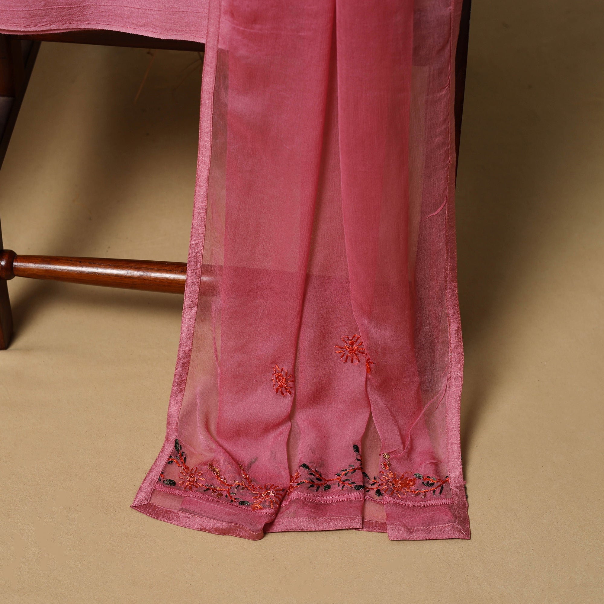 3pc unstitched dress material showcases detailed french knot hand embroidery crafted by skilled artisans from West Bengal. The muslin silk viscose blend kurta and chiffon viscose dupatta are adorned with fine hand embroidered motifs, creating a rich textured look. It is paired with a plain santoon taffeta bottom that balances the detailed surface work. A refined choice for festive gatherings, family functions and cultural celebrations.