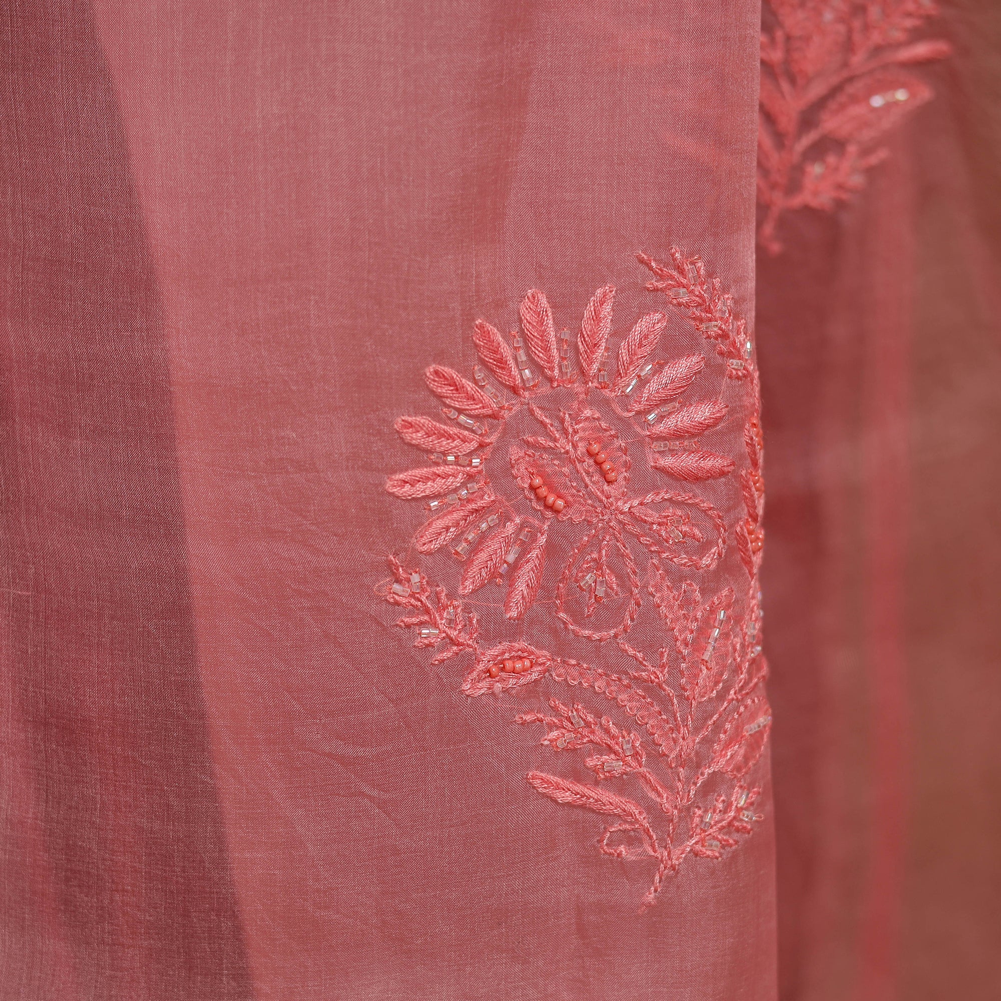 Intricately and artfully crafted, this beadwork pink chikankari organza silk saree celebrates the heritage handwork of Lucknow, Uttar Pradesh. Known for its delicate thread motifs and subtle elegance, Chikankari features meticulously hand-embroidered designs made with soft pastel threads that form graceful floral and paisley patterns. The saree beautifully blends tradition with artistry, making it perfect for weddings, festive celebrations, cultural gatherings, and elegant evening occasions.