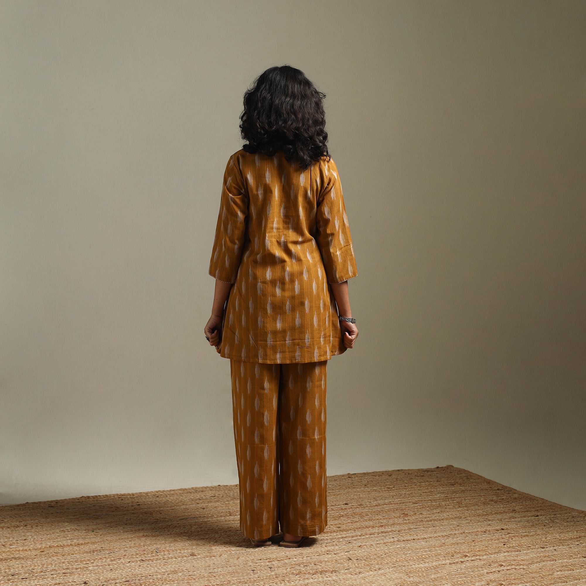 Hand embroidered pochampally ikat night suit set, made from breathable cotton, blends comfort with artisanal charm. The Ikat patterns are created by dyeing the yarns before weaving. It features relaxed-fit top and matching palazzo with elasticated waist and two side pockets. Designed thoughtfully for cozy evenings and restful nights.