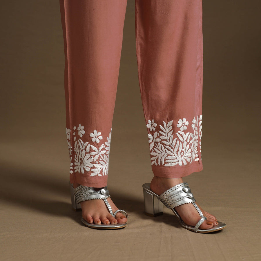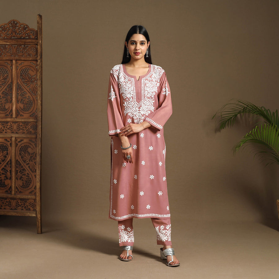 Celebrating the beauty of peach hand embroidered rayon Chikankari kurta with a matching pant set is a masterpiece of craftsmanship. Chikankari, a traditional textile art from Lucknow, is renowned for its delicate and intricate hand embroidery. The threads are skillfully embroidered on cool, pastel shades in light garments, creating a beautiful blend of craftsmanship. The straight-fit kurta and matching pants offer elegance and comfort, making it an ideal choice for festive celebrations or everyday wear.