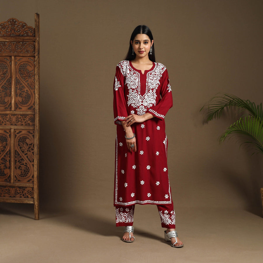 Celebrating the beauty of maroon hand embroidered rayon Chikankari kurta with a matching pant set is a masterpiece of craftsmanship. Chikankari, a traditional textile art from Lucknow, is renowned for its delicate and intricate hand embroidery. The threads are skillfully embroidered on cool, pastel shades in light garments, creating a beautiful blend of craftsmanship. The straight-fit kurta and matching pants offer elegance and comfort, making it an ideal choice for festive celebrations or everyday wear.