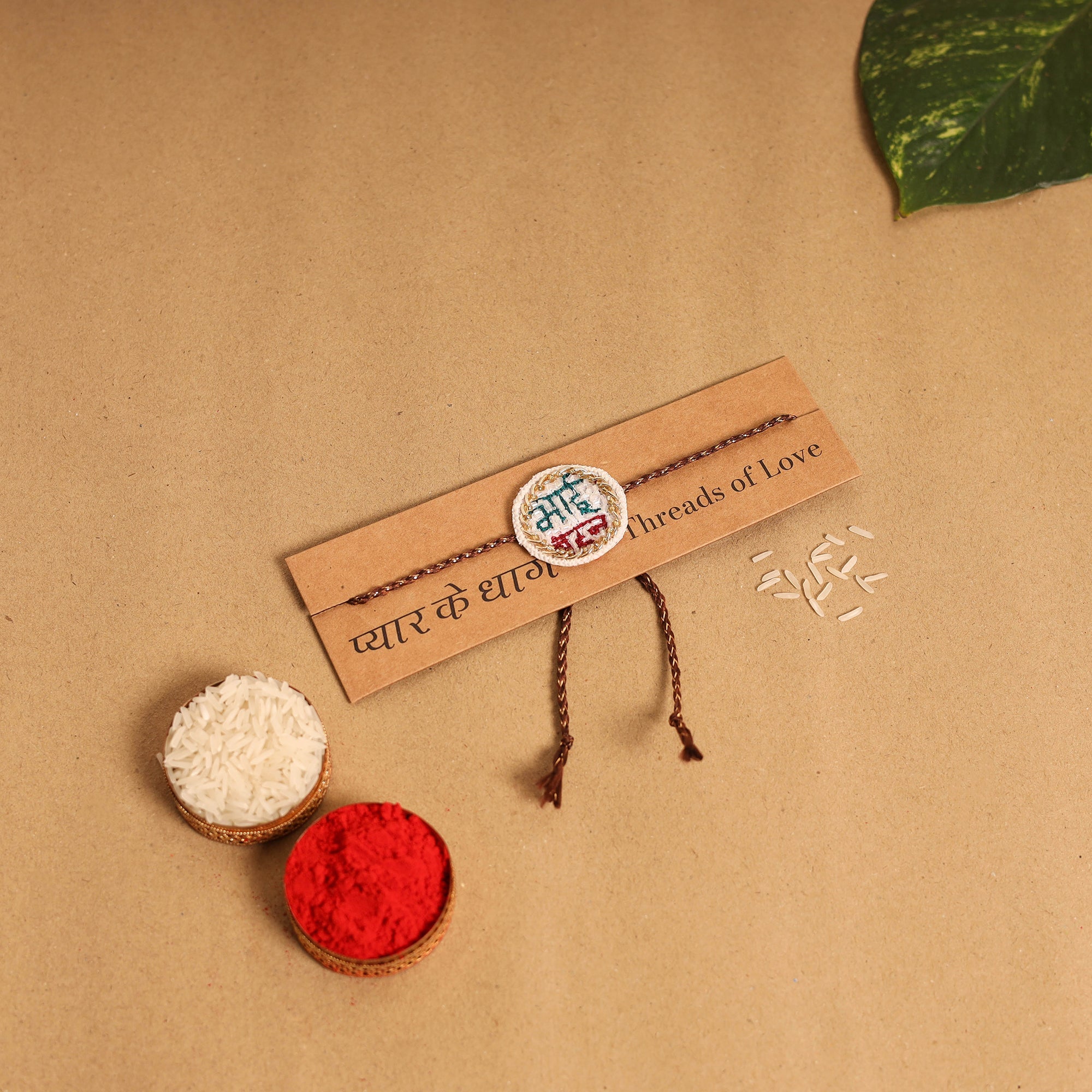 Celebrate Raksha Bandhan with this delicately hand-embroidered rakhi, adorned with vibrant thread work that reflects timeless traditions. Designed with love and care, it brings a personal touch to the sibling bond. Packed in a beautifully crafted potli, it serves as a meaningful gift for this special occasion.