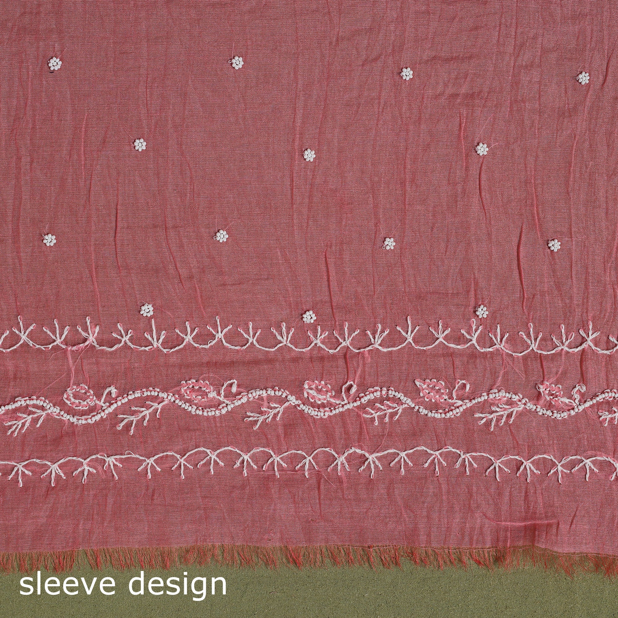 2pc pink chikankari dress material set includes a beautifully hand-embroidered kurta with a matching dupatta, both crafted in chanderi silk x mul cotton. The dupatta is enhanced with delicate zari borders and tassels. Chikankari, a traditional embroidery art from Lucknow, showcases fine craftsmanship and cultural heritage.