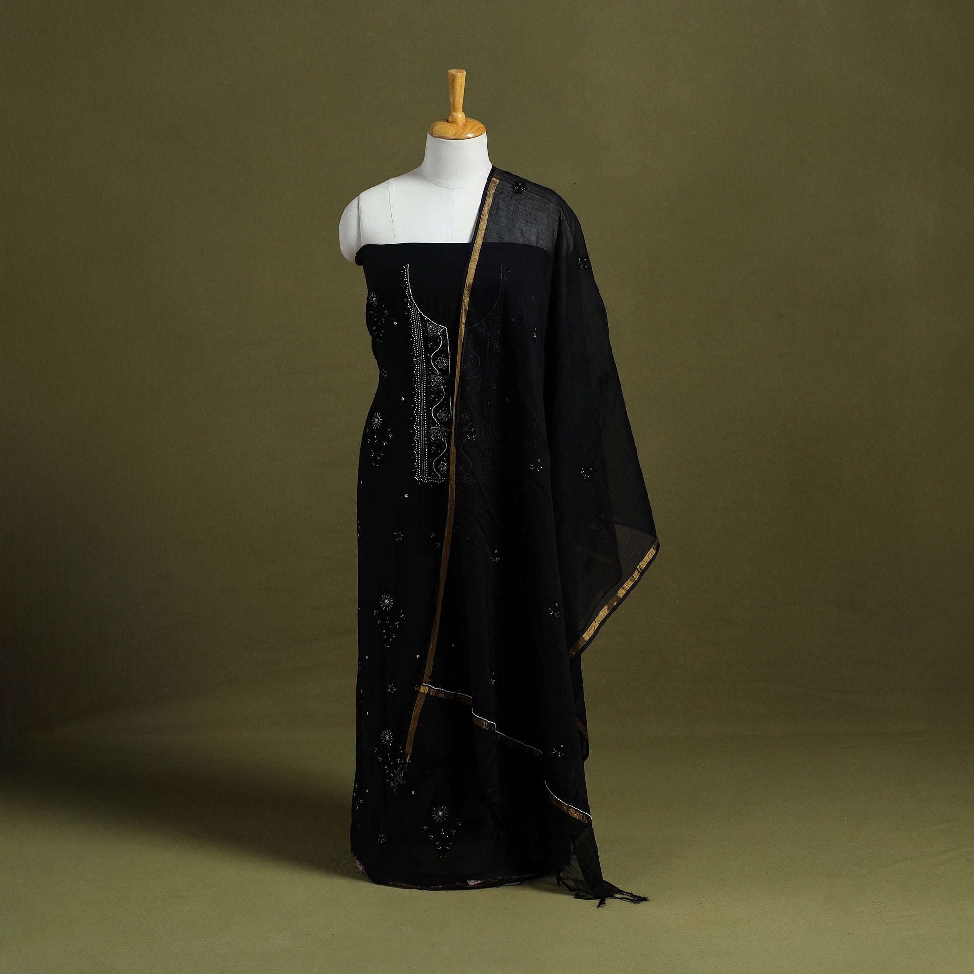 2pc black chikankari dress material set includes a beautifully hand-embroidered kurta with a matching dupatta, both crafted in chanderi silk x mul cotton. The dupatta is enhanced with delicate zari borders and tassels. Chikankari, a traditional embroidery art from Lucknow, showcases fine craftsmanship and cultural heritage.