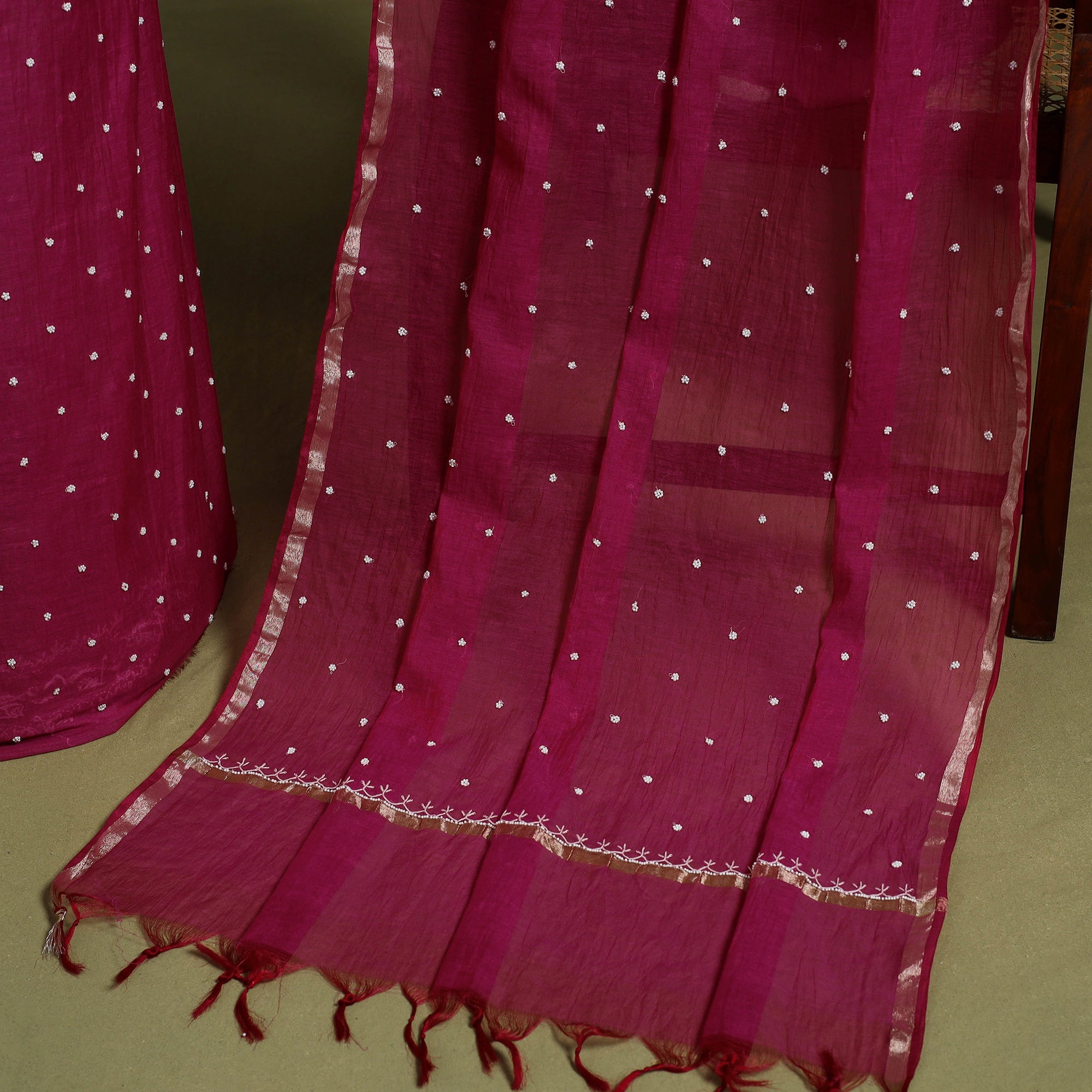 2pc pink chikankari dress material set includes a beautifully hand-embroidered kurta with a matching dupatta, both crafted in chanderi silk x mul cotton. The dupatta is enhanced with delicate zari borders and tassels. Chikankari, a traditional embroidery art from Lucknow, showcases fine craftsmanship and cultural heritage.