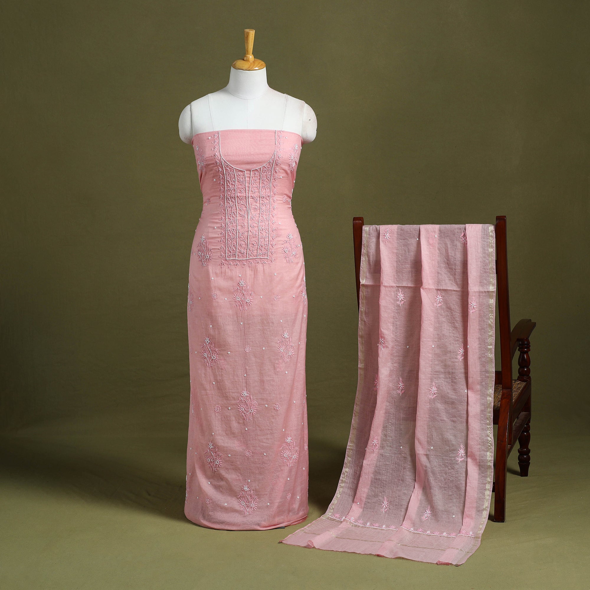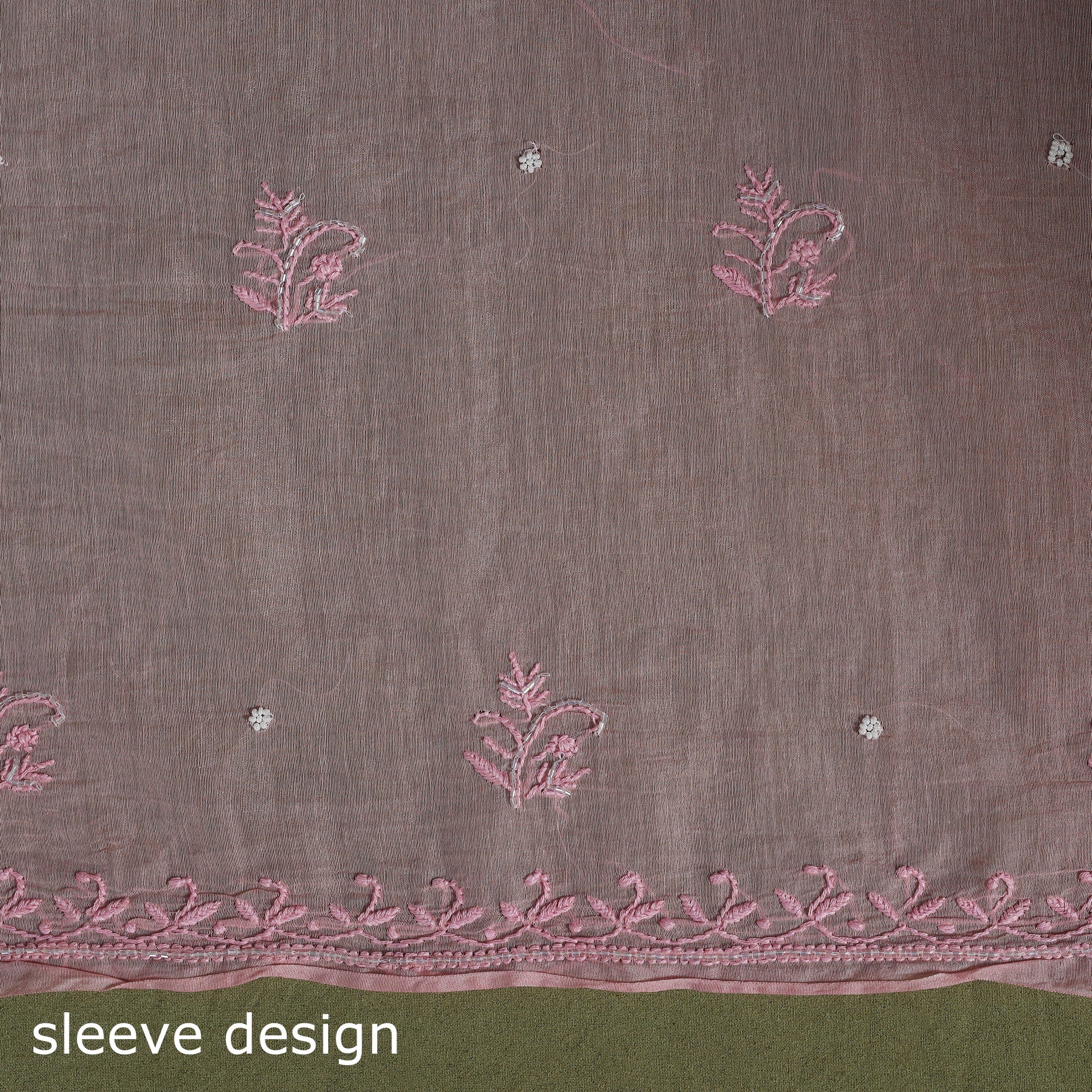 2pc pink chikankari dress material set includes a beautifully hand-embroidered kurta with a matching dupatta, both crafted in chanderi silk x mul cotton. The dupatta is enhanced with delicate zari borders and tassels. Chikankari, a traditional embroidery art from Lucknow, showcases fine craftsmanship and cultural heritage.